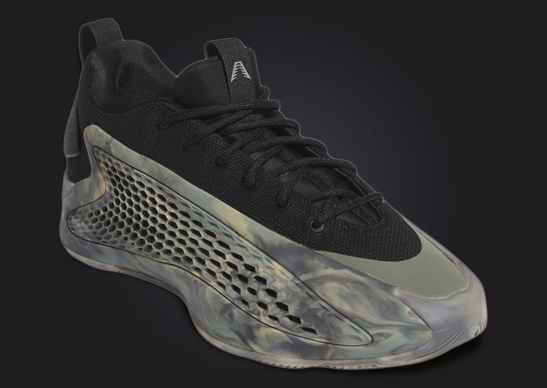 Featuring a Primeblue knit upper in black, the adidas AE 1 Low Ascent houses a TPU midfoot panel adorned with a distinctive honeycomb structure. This panel captures attention with its swirled, marbled grey pattern. Grey accents also enhance the toecap and the iconic Three Stripes logo on the faux carbon fiber heel counter, maintaining the sneaker's sleek and modern aesthetic. More branding is found via the tongue, with Anthony Edwards’ logo also getting a grey finish. Underfoot sees a new cushioning setup and design with Light Boost utilized throughout, unlike the Lightstrike and Jet Boost found in the OG mid-cut. This cushioning system is encapsulated within the marbled grey rubber outsole.