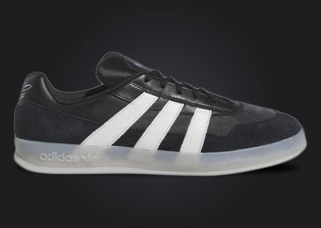 The Aloha Super goes noir here with a sturdy black suede wrapping from the mudguard back to the heel, met by light black nubuck and leather above. Gonzales' whimsical Shmoofoil character proudly sits atop the tongue, while his signature is embroidered onto the heel in white. The Three Stripes on the midfoot get a refined touch with a white leather finish, contrasting against the overall dark theme. A semi-translucent midsole and outsole in white provide the finishing touches.