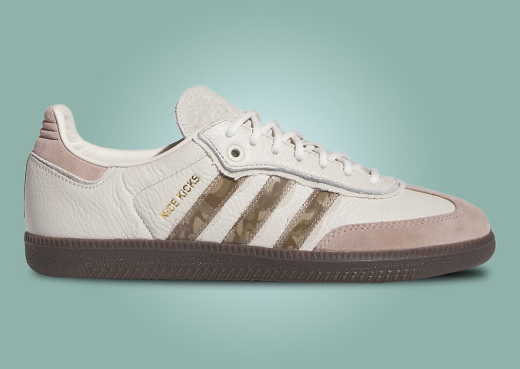A closer look at the designs reveals meticulous attention to detail and a desire to elevate the classic adidas Samba. For Nice Kicks' rendition, talc-hued tumbled leather engulfs the upper, offset by suede touches on the toe overlay and heel tab. The spotlight, however, is on the branding, where the standard Samba text makes way for a gold-foiled Nice Kicks emblem. The Consortium Cup hangtag adds a special touch, commemorating the design's origin. The most striking feature is the Three Stripes logo, artistically torn at the edges, lending a rugged charm. The co-branding between adidas and Nice Kicks is delicately spread out, appearing on the tongues and insoles. Completing the aesthetic is the classic gum rubber midsole and outsole.