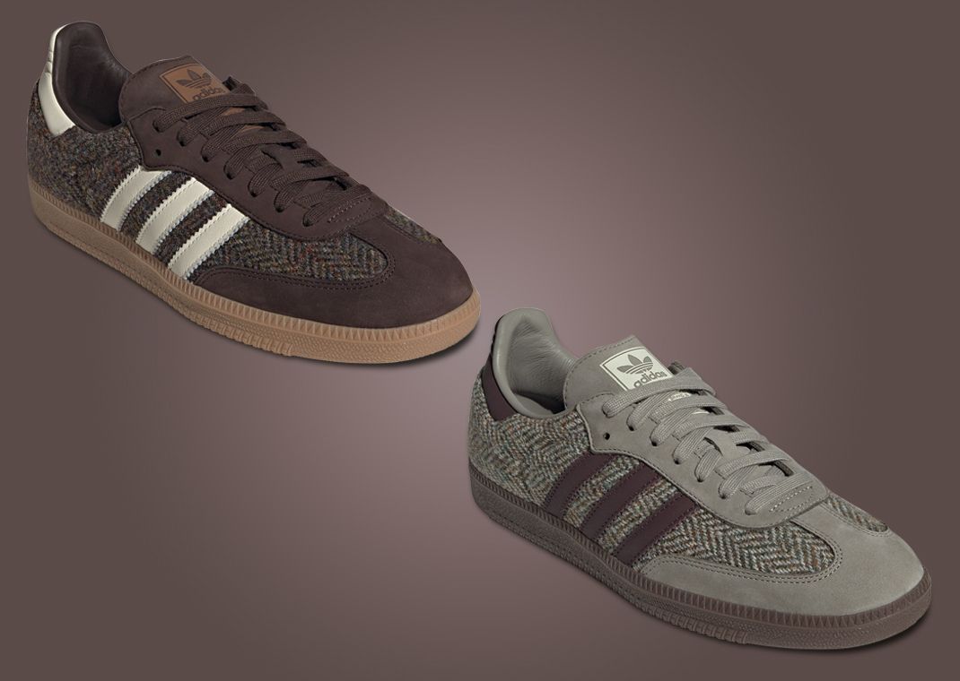 Both pairs in the adidas Samba OG Tweed Pack feature uppers constructed from the famous Harris Tweed of Scotland that has been sourced by the inline team at adidas HQ in Herzogenaurach, with nubuck overlays being used for the lace stay and toe guard. The herringbone pattern of the tweed presents different tones; one pair is in hues of wonder beige, subtly contrasted by shadow brown Three Stripes on the sides and heel, featuring a wonder white decal upon the tongue. They sit atop a dark gum sole to finish the design. The accompanying pair in the pack sees an upper adorned in dark brown tweed; again, the herringbone pattern is visible, and multiple colors are intertwined. The Three Stripes on the sides and the heel tab are applied using cloud-white leather. A gum-colored tongue tag is visible, with the shoe finished by a matching colored sole