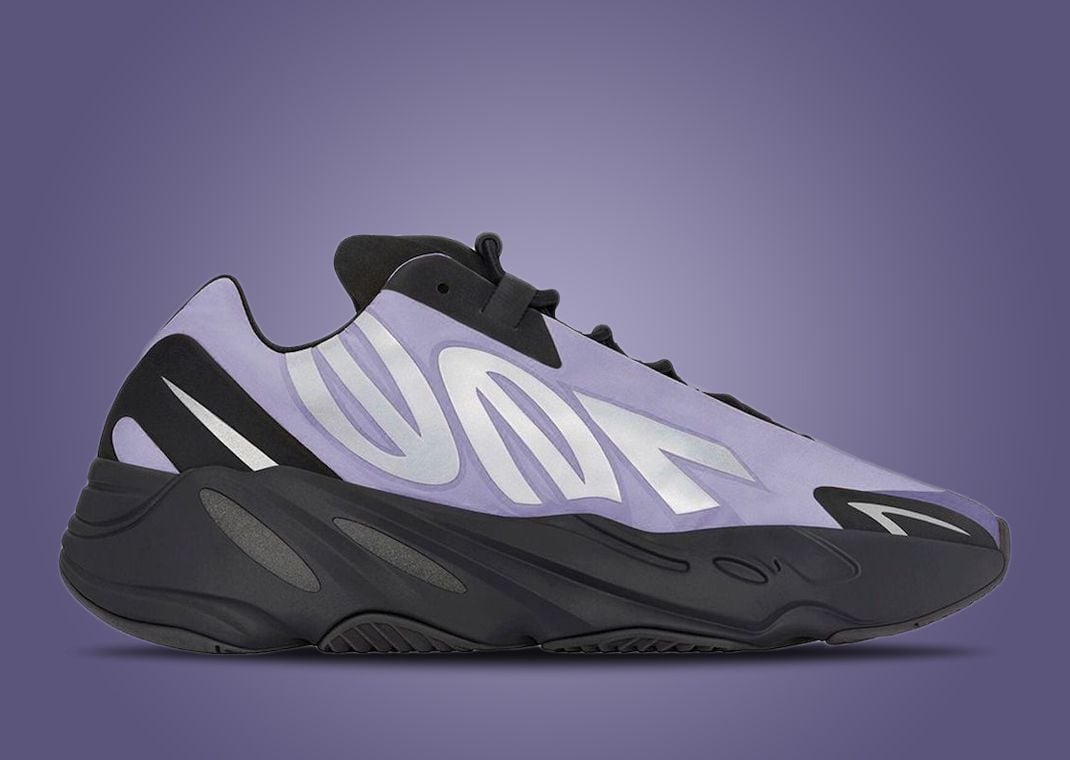 Taking over the waterproof polyester material that covers the internal bootie construction is a light lavender color. Deviating from the usual design language of minimal branding, "700" text is placed on the lateral side with a mirrored version appearing on the medial. A set of infinity loop laces make their way onto the black neoprene tongue, though an extra set of standard laces come in the box if you choose to switch them out. Down below, the famous 700 midsole and outsole are present in all-black with some minor upgrades. More durable rubber is used on the entire sole unit while still providing immaculate comfort through the full-length Boost cushioning that is present.