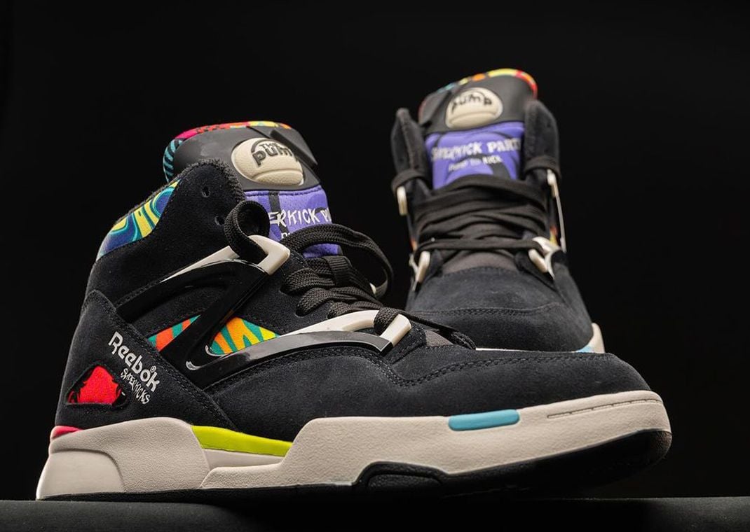The AEW x The Young Bucks x Reebok Pump Omni II Superkicks features a predominantly black suede upper, exuding a sleek and premium look. This base is accented with multi-color hits through various patterns on the tongue, midfoot, and collar, adding a vibrant and eye-catching contrast. The Superkick Party branding adorns the tongue and lateral heel, celebrating the iconic move that has made The Young Bucks famous.