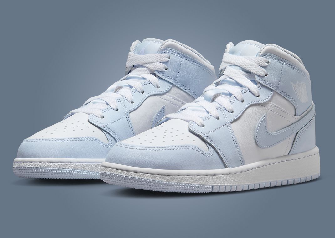 The kids' exclusive Air Jordan 1 Mid Cobalt Bliss showcases a delightful blend of soft white and light blue hues. The sneaker's base features white leather underlays paired with cobalt bliss overlays. The iconic Wings logo, embossed in white, is on the ankle. The design is completed with a white midsole atop a cobalt bliss-colored solid rubber outsole.