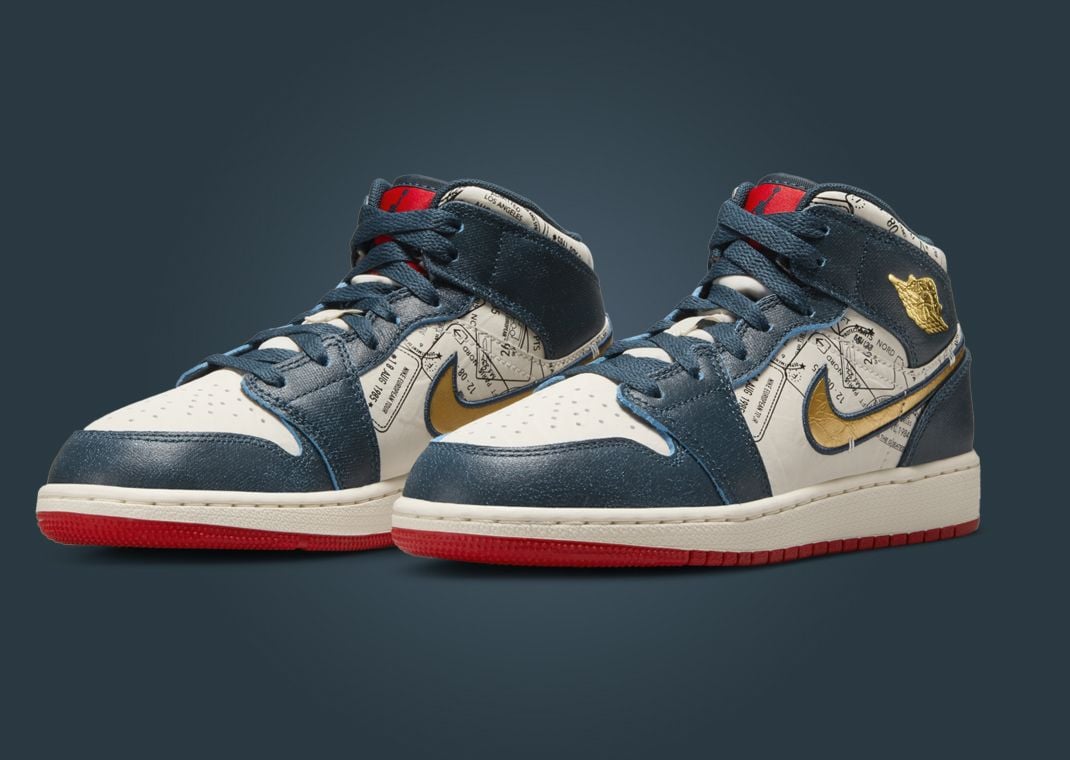 This new iteration of the Air Jordan 1 Mid stands out with its navy textured leather overlays, crafted to potentially reveal a lighter blue hue over time. This texture adds an element of surprise and longevity to the design. The underlays in a creamy finish are adorned with various passport stamps on the midfoot panel. Each stamp commemorates a significant event in Jordan's career. Notable moments like the shattering of a backboard in Italy and his gold medal triumph with Team USA are creatively encapsulated in these stamps.