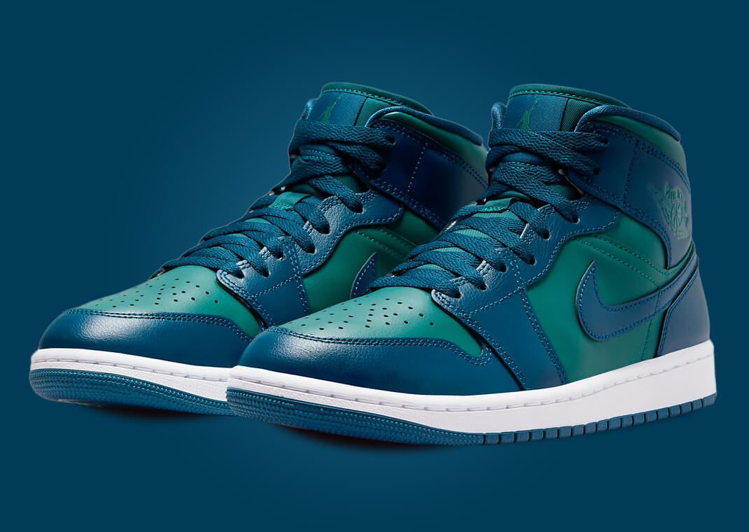 Channeling the blues and greens in the Air Jordan "Skyline" ad, this AJ 1 Mid comes in Sky J Teal, Sky J French Blue, and white. The two-tone color-blocked upper is all-leather, split between blue overlays and teal underlays. A white midsole provides the only break in color as the solid rubber outsole is decked out in Sky J French Blue.