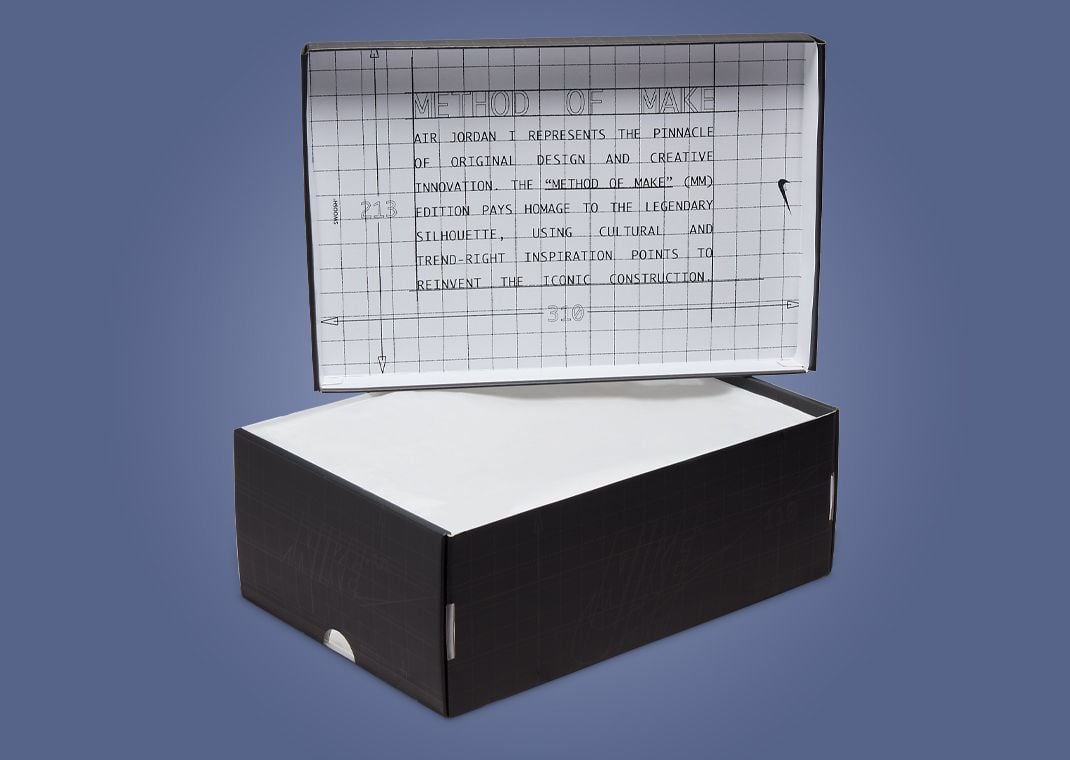 Before you even see the sneakers, the experience begins with the packaging. The Air Jordan 1 MM Low Midnight Navy comes in a sleek black shoe box with the Nike logo sketched on each side. Under the box lid, you'll find more sketch-style writing detailing the purpose and inspiration behind the MM revamp, setting the tone for the beautiful sneakers that lie within.