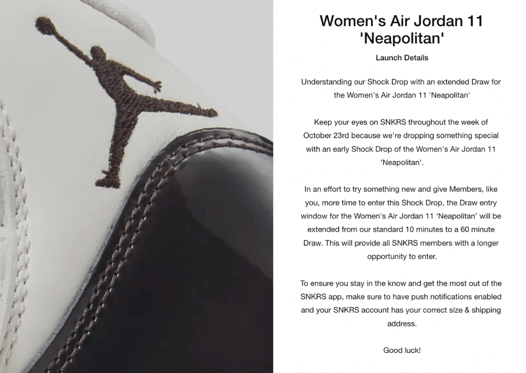To access the shock drop for the Jordan 11 Neapolitan, you must have the Nike SNKRS App downloaded and are signed into your account. Once the draw goes live, you’ll have 60 minutes to enter, an extended time from Nike’s usual 10-minute entry period. Nike explains that the increase in time is to “try something new and give Members, like you, more time to enter this Shock Drop.”
