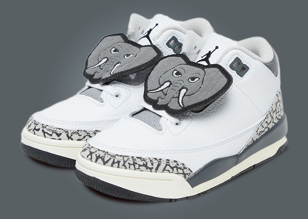 A part of the "Hide N' Sneaks" Pack (get it?), this kid's exclusive Air Jordan 3 Retro comes in a clean white, black, iron, light ash grey, sail, and cement grey colorway. A new take on the classic "White Cement," this pair features a white-based tumbled leather upper with various shades of grey serving as accents throughout. Elephant print is found in its traditional places, which will be updated to be more inline with the original '88 specs, like the Reimagined "White Cement." A sail-colored midsole and black outsole complete the look. But, that's not all! Included with the Air Jordan 3 Retro "Hide N' Sneaks" will be a cartoon elephant patch. This add-on will be fully-removable, hung from the top eyelet on GS pairs, while the PS and TD version will come sitting atop the laces.