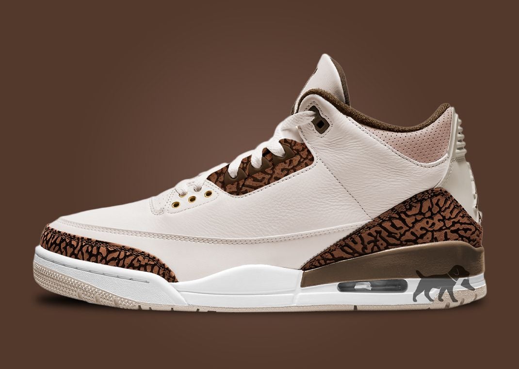 Featuring a suede upper, the silhouette is doused in a creamy shade throughout most of its design while we see accenting hits of various browns around select details of the sneaker. For its elephant print, Jordan Brand sticks to the classic pattern with a brown-shaded suede appear on the mudguard, heel, and even on the uppermost eyestays while the metallic eyelets below get a golden makeover. TPU eyelets near the top portion of the lacing system come in a chocolate brown hue with the Jumpman logo and sockliner nearby continuing this shade. Perforated details around the collar come in a tan hue that contrasts the creamy shade of the Jumpman-branded heel tab. Rounding out the design is the AJ 3 midsole which comes in white and brown with exposed Air near the heel paired with a tannish-grey rubber outsole.