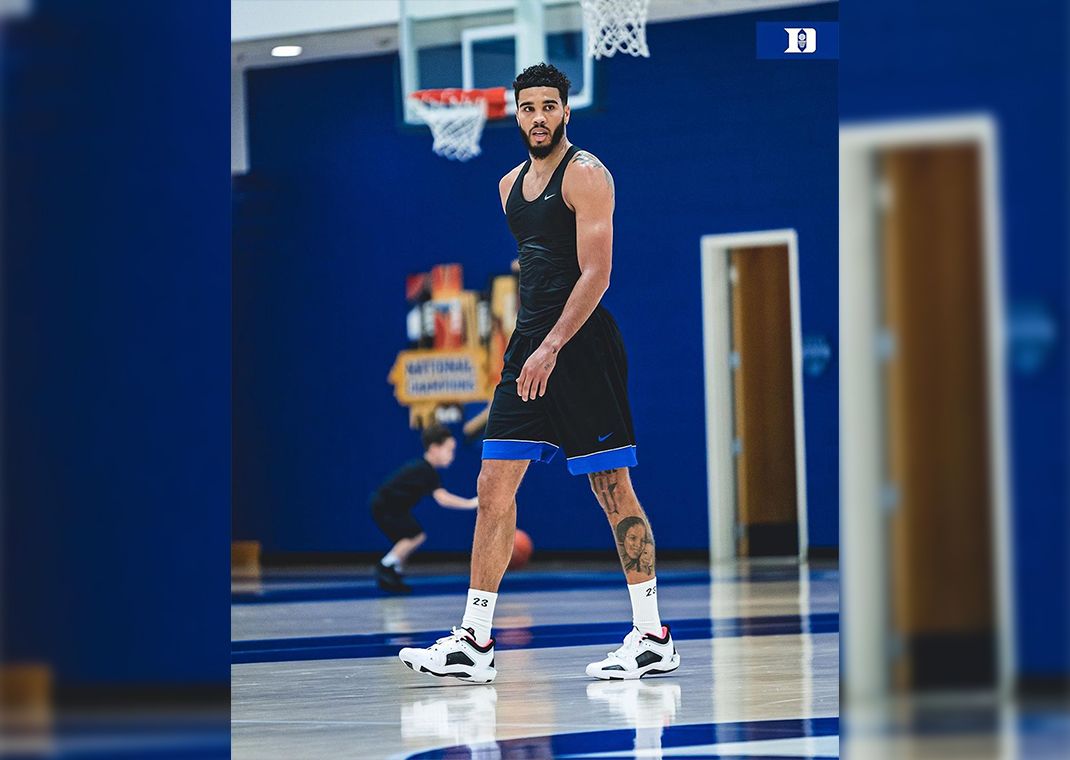 Although we have to wait until next year for Boston Celtics star Jayson Tatum’s signature silhouette with Jordan Brand, he is still being spotted rocking unreleased Jordans and PEs alike. During a recent workout at his alma mater Duke University’s gym, the public was able to catch a glimpse of yet another sneaker yet to see the light of day, the Air Jordan 37 Low.