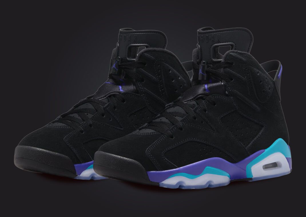 Coming covered in black nubuck, this Jordan 6 features tonal black stitching throughout that allows the aqua and purple accents to shine through. More black-on-black shades land on the lace set and tongue while purple takes over the Jumpman on the tongue cover and lace locknearby. Working back, you find more details normally on the AJ 6 like the perforated collar and spoiler pull tab with the latter of these two getting a small hit of purple. Underfoot, the midsole features a combination of purple and aqua blue for its foam portion while the exposed Air unit in the heel is encapsulated by a semi-translucent icy blue rubber. Rounding out the design is the black and icy blue outsole.
