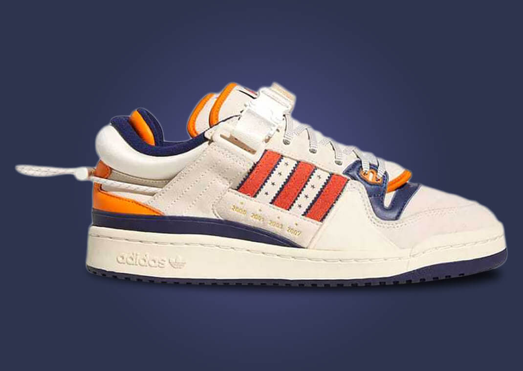 Unlike his previous work on the model, Bad Bunny’s basketball team-inspired take on the Forum Buckle Low features an all-over suede construction with tonal stitching details adding depth to the upper. This material makeup is found along the mudguard, toebox, tongue, eyestays, and tongue in a grey shade while the midfoot features Three Stripes branding in a contrasting orange hue. Navy hits appear on the vamp, lower eyestay, sockliner, and near the heel with our final accenting color coming via a more true orange on the TPU eyelets and tongue lining.