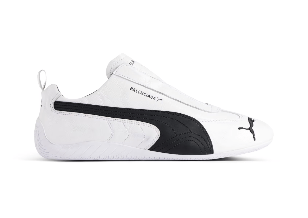 Showcased at the brand’s Winter 2025 fashion show yesterday, the Balenciaga x Puma collection takes inspiration from Puma’s innovations in soccer and motorsports. For the footwear, they’ve only decided to tackle one model — the Puma Speedcat — and recontextualize it by reimagining the silhouette with a worn-out suede upper.
