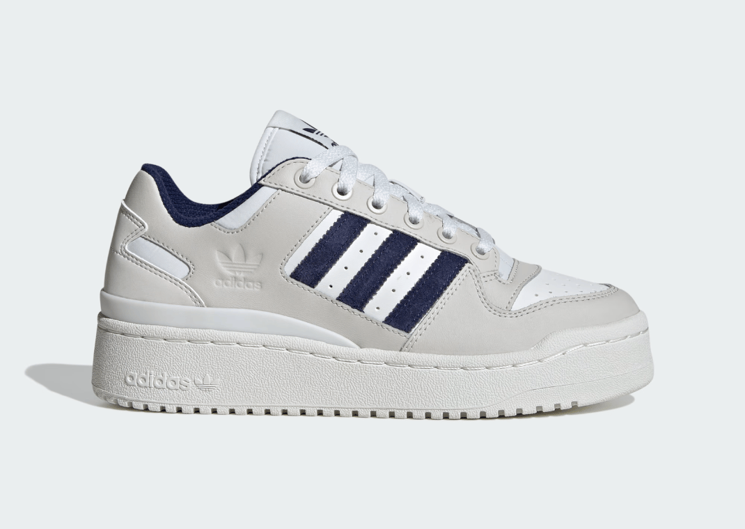 Another women-exclusive release, the adidas Forum Bold "Crystal White Dark Blue," offers a crisp, clean aesthetic with its contrasting dark blue accents. The shoe’s platform sole and enlarged branding allow it to stand out amongst standard adidas Forum Low colorways. Besides the dark blue hits on the osckiner, Three Stripes, and tongue tag, the sneaker features grey and white on its various overlays and underlays. Down below, a cream-colored rubber midsole and outsole complete the look.