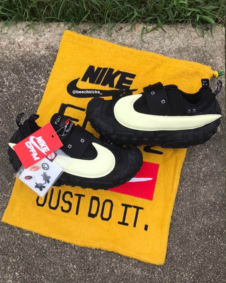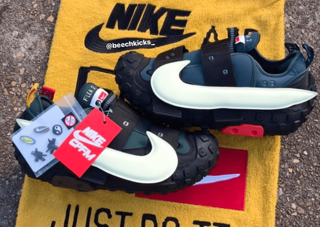 Following the confirmation that the CPFM x Nike Air Flea 2 was releasing, Brendan Dunne of Complex discovered images of the sneaker. Seen on the feet of Franz Lyons, the bassist of the band Turnstile, the silhouette gives off heavy Balenciaga Defender vibes with its aggressive rubber sole unit. On the upper, we see what appears to be neoprene being secured by two forefoot straps, each hosting buttons. The lateral side is home to a large white Swoosh, which is possibly removeable as the right sneaker is pictured without it. Other details found across the model include Flea 2 branding on the tongue and pull tab as well as included charms featuring yin yang and Nike Swooshes.