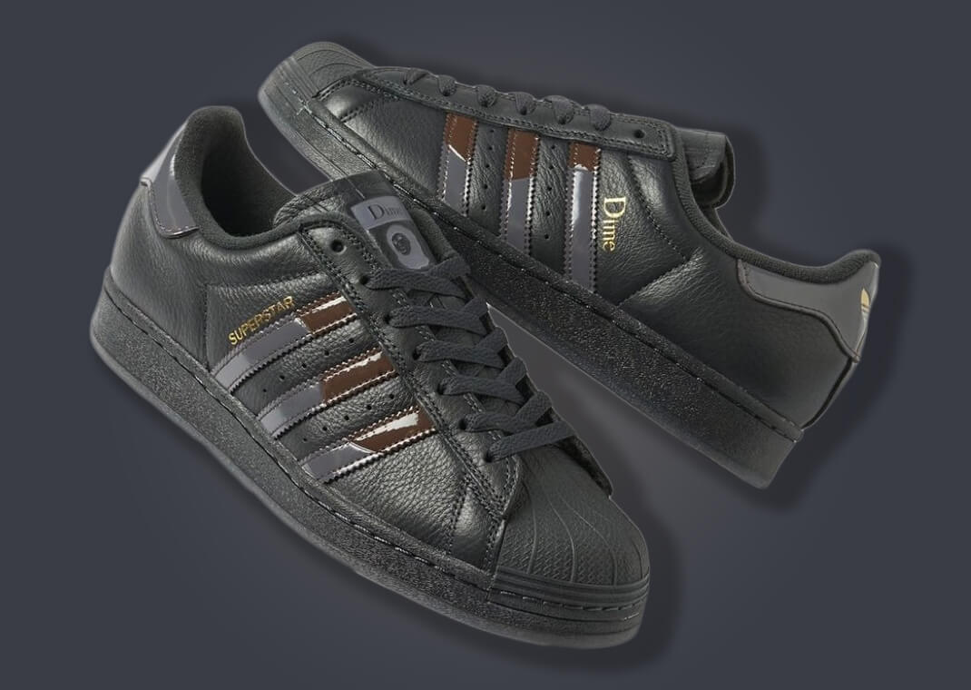 The Dime x adidas Superstar ADV Pack features two colorways: Cloud White and Carbon. Both pairs showcase a high-quality tumbled leather upper with the iconic shell toe. Dime branding appears on the tongue, right sneaker's heel, and lateral midfoot of the left sneaker. The Three Stripes branding receives a split design, with brown and grey accents on the black pair and halo blue and tan on the white pair. A midsole matching the upper of itsrespective colorway sits underfoot, while the outsole comes in a semi-translucent finish.