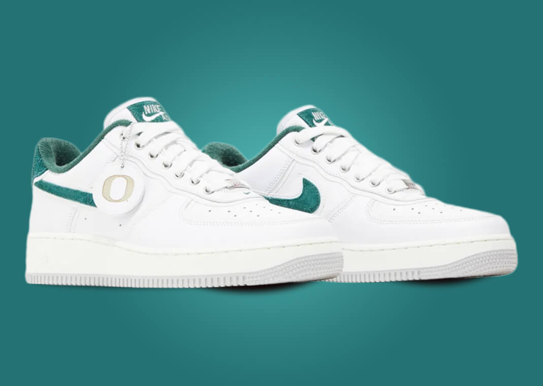 Limited to just 2,200 pairs worldwide, this Air Force 1 Low iteration speaks to the university's proud legacy and the forward-looking ethos of Ducks of a Feather. The shoe’s predominantly white leather finish is interrupted by green suede accents, carefully placed on the Swoosh, tongue tag, and heel. A nuanced touch sees the suede's green shade subtly differing from the sockliner’s hue. The rear of the sneaker sees the iconic “O” logo of the University of Oregon elegantly embroidered in white. At the same time, a gold hangtag bearing "Ducks of a Feather" signifies the project's connection to the NFT platform. The ensemble rests atop a pristine white midsole, complemented by a contrasting grey outsole. The packaging resonates with the collaboration’s essence for collectors: a green-hued, co-branded Oregon Ducks and Nike box stamped with "LIMITED" on its flank.