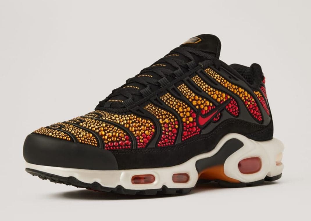 Nike Air Max Plus: Two Swarovski makeovers are featured, one inspired by the OG Sunset colorway and a new black-and-white Moonlight colorway. The Sunset colorway features vibrant orange and yellow tones, covered in sparkling Swarovski crystals, while the Moonlight colorway combines elegant black-and-white hues with subtle crystal embellishments. Both designs offer a luxurious twist on the classic Air Max Plus silhouette.