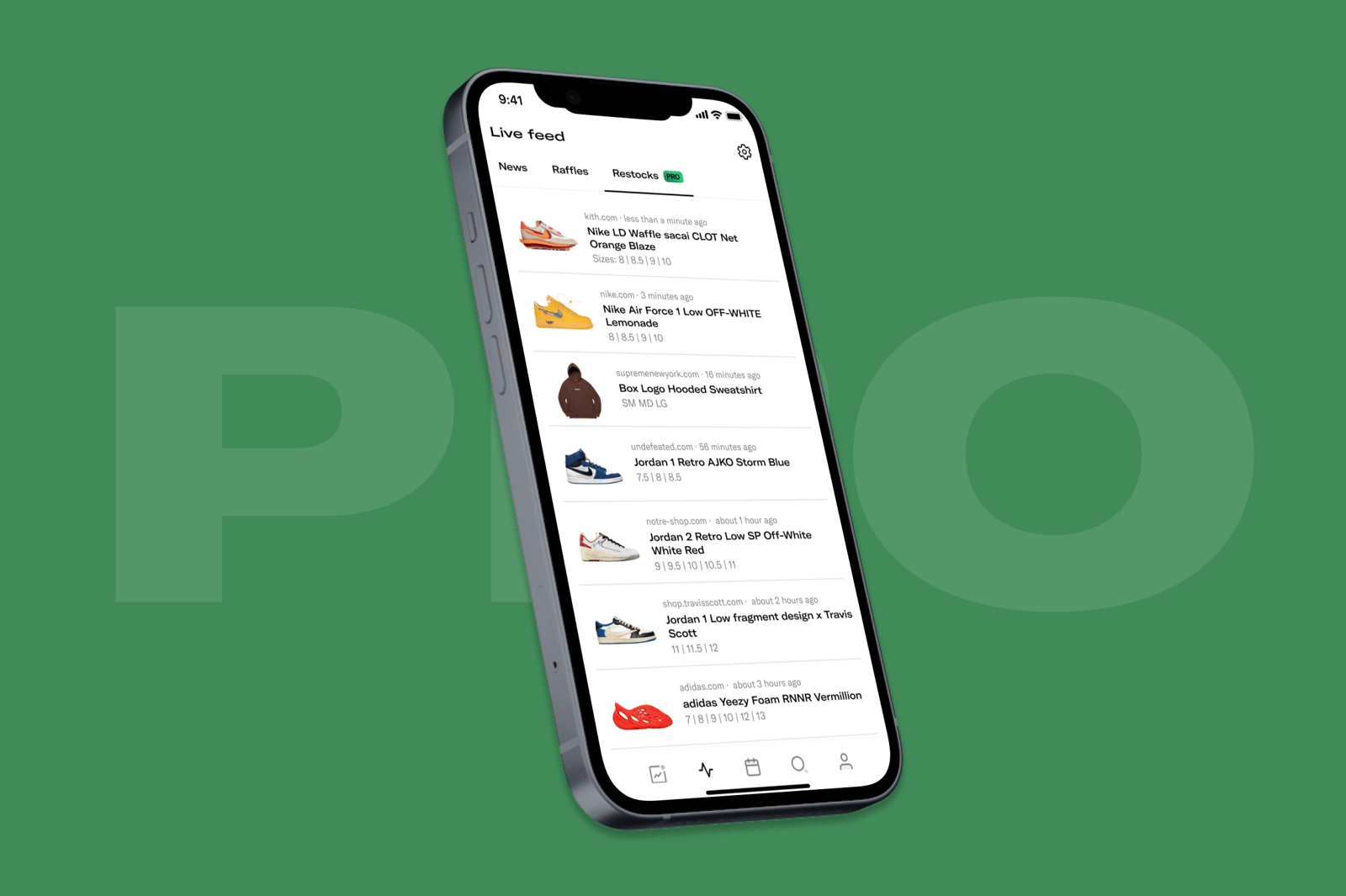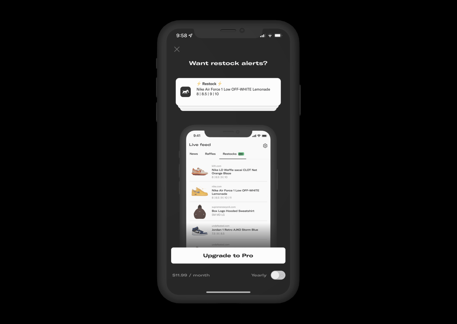 Now, alongside the exciting release of our highly-anticipated new Restocks feature (full explanation to follow below), we've introduced a second pricing plan - the $11.99/month Pro option. Access to the Restocks feature is exclusively available to users on the Pro plan. Existing Basic users may upgrade to Pro at anytime by navigating to the Live Feed screen within the app and tapping the Restocks tab.