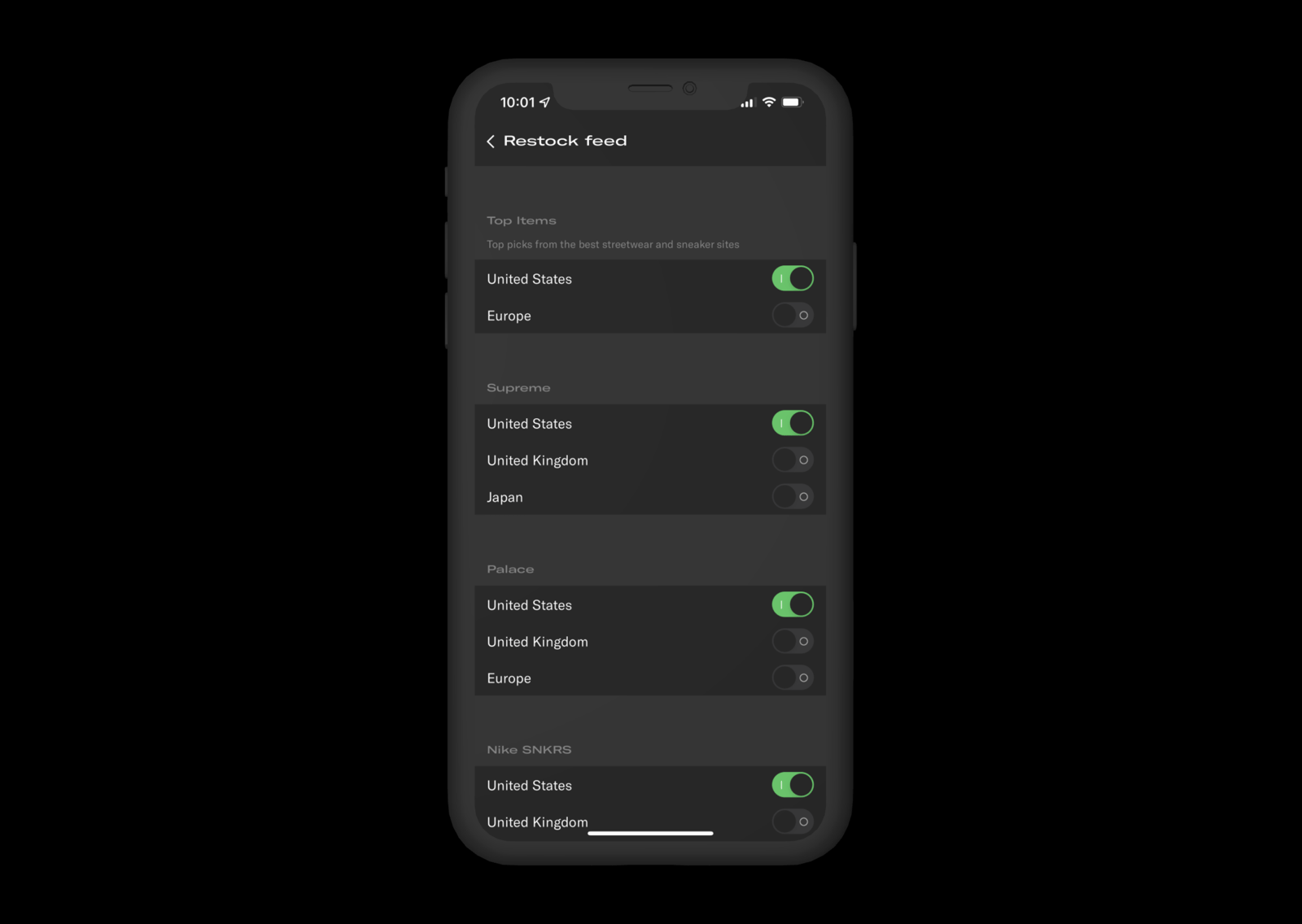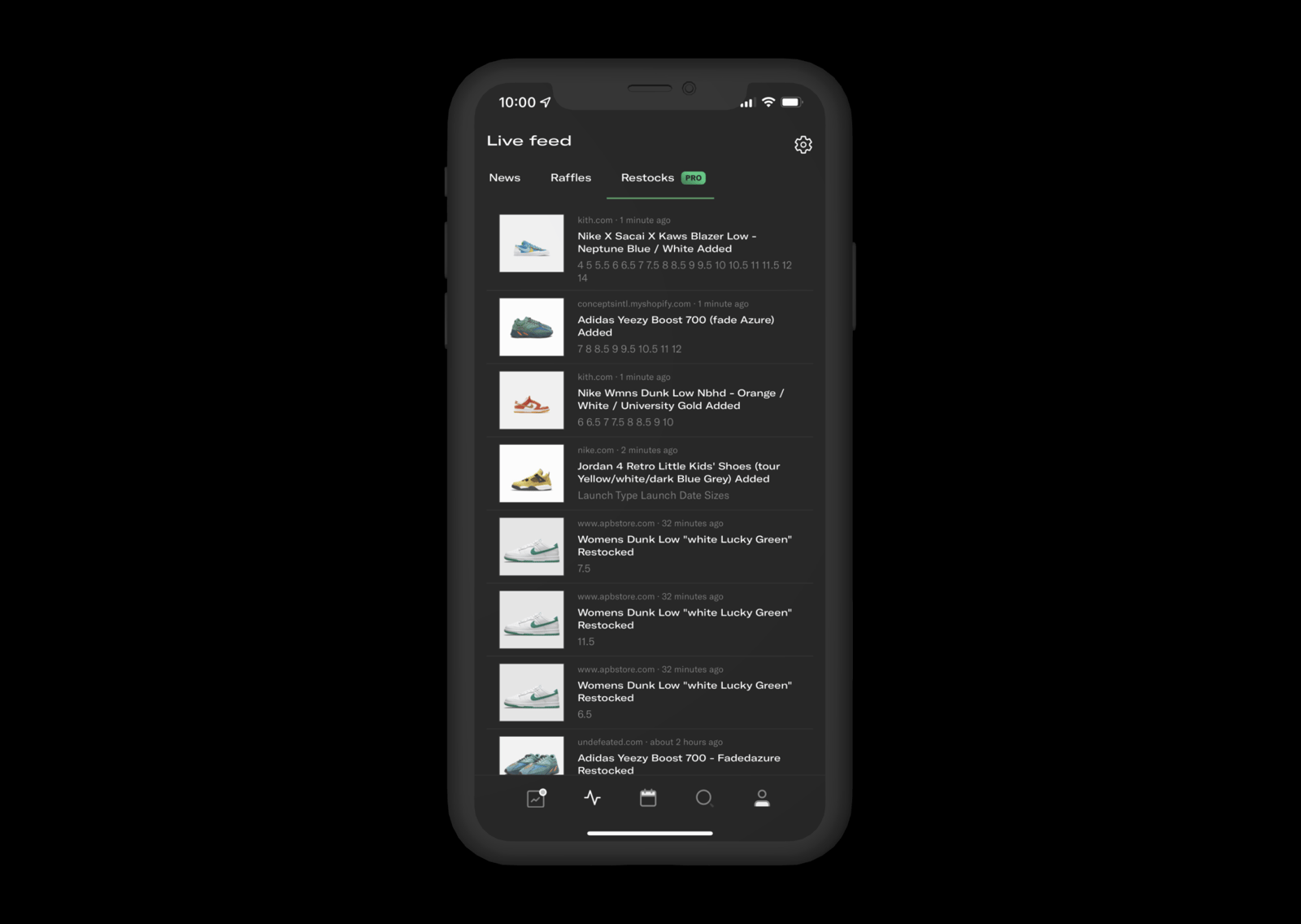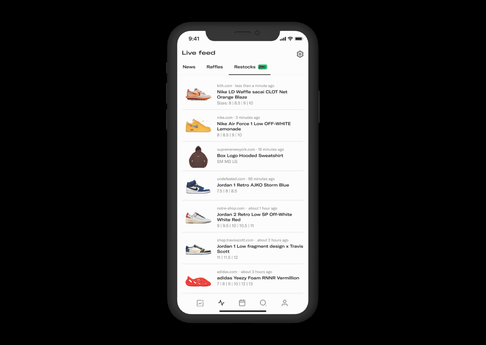 Located on the Live Feed screen of the app, Restocks allows users to receive real-time alerts when top products from their favorite sneaker and streetwear sites come back in-stock thanks to our custom configured, automatic site monitors. With our custom set of feeds to select from, you’re in the driver's seat - set alerts for everything you want, nothing you don’t. From Nike and adidas, to Supreme, Palace, and more, we’ve got you covered.