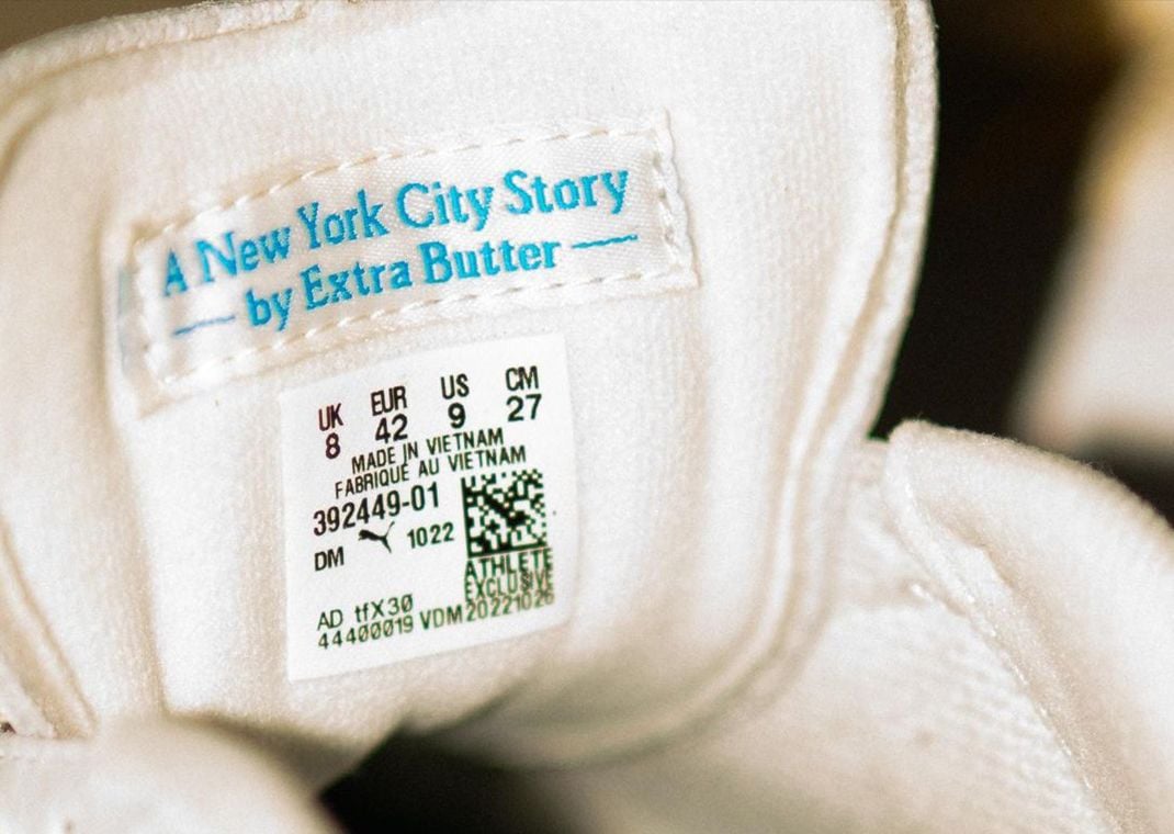 Early teaser photos don’t give us an entire look at the silhouette, though we do see it keeps its usual leather construction with this colorway coming in a two-tone blue and white. Branding details take on this blue hue while the rest of the model (at least the parts that are visible at this time) take on a white finish. On the back of the tongue, a tag denoting the Extra Butter connection and the title of the collaboration “A New York City Story” are embroidered in blue.