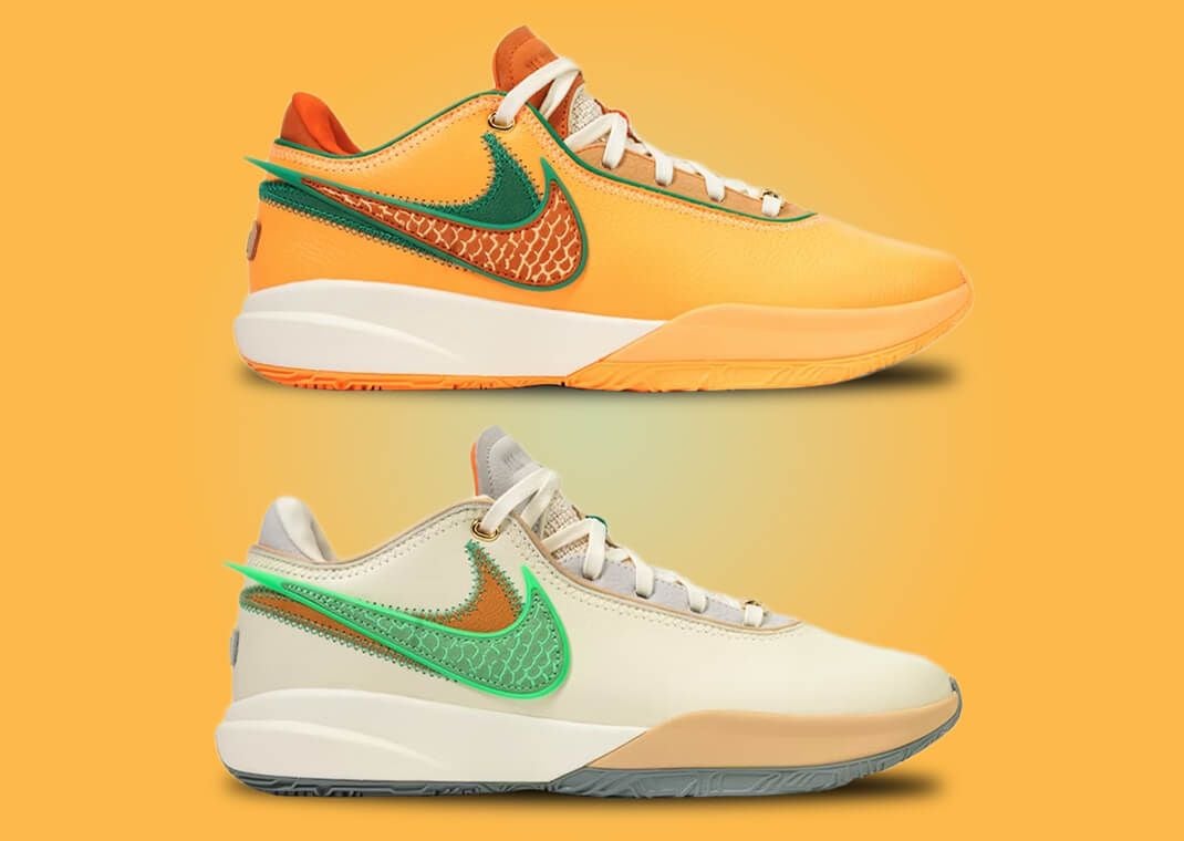 Within this two-pack of LeBron 20s are "Safety Orange" and "Coconut Milk" colorways featuring FAMU’s color scheme throughout the design. Both pairs feature an all-leather upper with mesh panels on the tongue, the orange-based pair coming with pebbled leather, and the neutral-based colorway getting faux snakeskin. The colorway's titular shade covers most of the upper, while FAMU's colors land on the Swoosh logos. Snakeskin-like embroidery is present on the topmost lateral Swoosh, while debossed text on the tongue nods to the school. A contrasting foam midsole in a two-tone finish is paired with a monochromatic rubber outsole for both sneakers in the pack. Each pair is housed in custom packaging featuring APB, FAMU, and Nike branding.