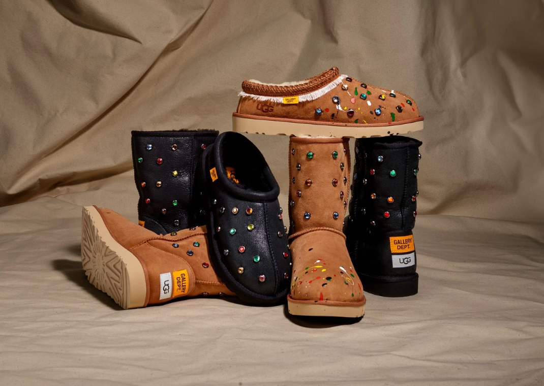Josué Thomas, the creative force behind Gallery Dept., has turned the brand into a cultural phenomenon in fashion. Known for its distinctive collaborations and celebrity endorsements, Gallery Dept. has become synonymous with avant-garde designs and high-profile partnerships. In its latest venture, the brand pairs with UGG, taking on the iconic Tasman Slipper and the Classic Boot, showcasing a fusion of streetwear edge and cozy, luxurious comfort.