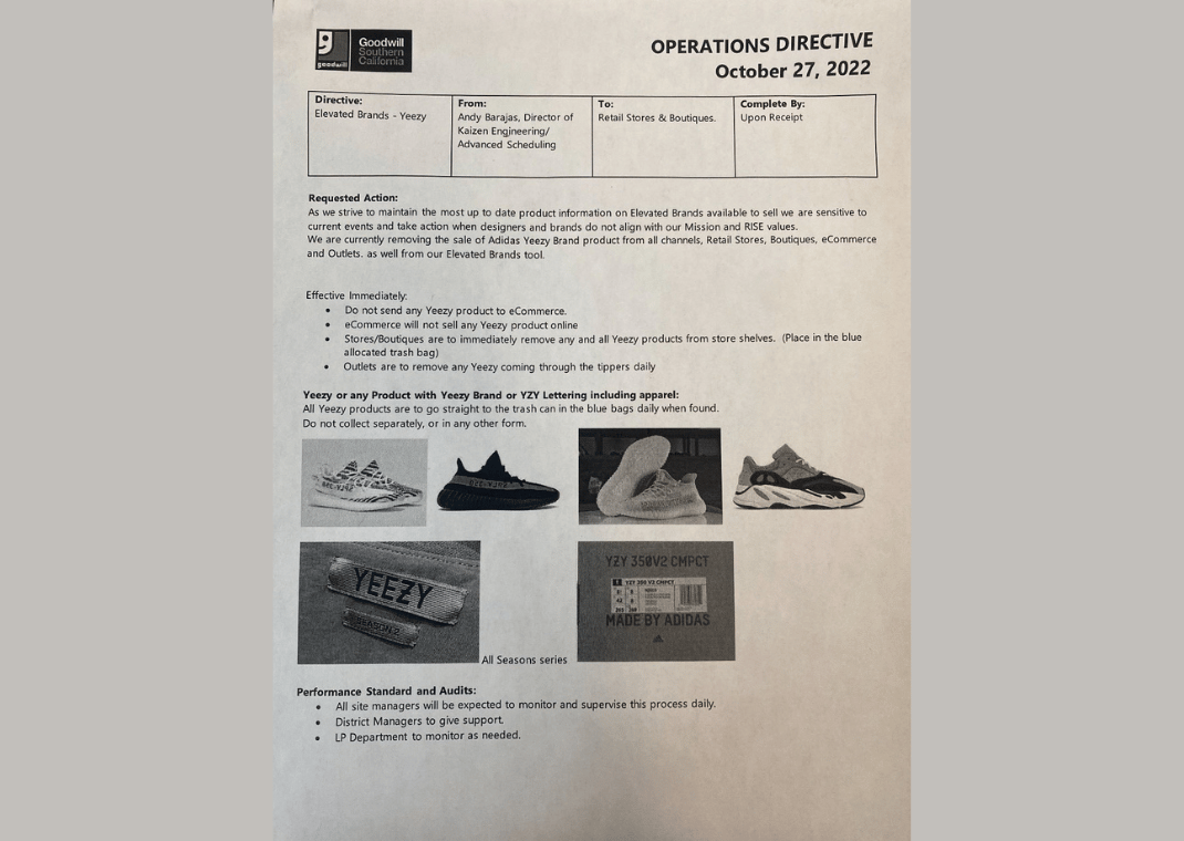Directly from this memo that was sent by Andy Barajas, Director of Kaizen Engineering/Advanced Scheduling at Goodwill, “As we strive to maintain the most up to date product information on Elevated Brands available to sell we are sensitive to current events and take action when designers and brands do not align with our Mission and RISE values. We are currently removing the sale of Adidas Yeezy Brand product from all channels, Retail Stores, Boutiques, eCommerce and Outlets. As well from our Elevated Brands tool.”