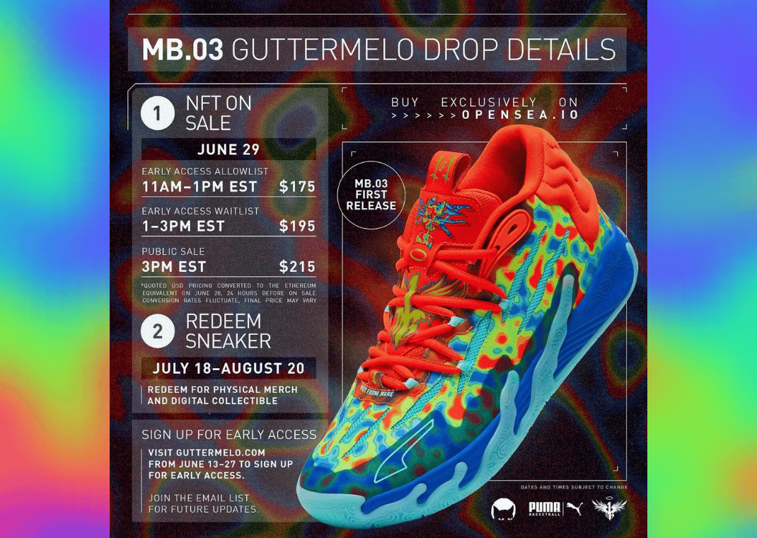 The Gutter Cat Gang x Puma MB.03 GutterMelo will be available to those who purchase the MB.03 GutterMelo NFT on June 29. This will take place on OpenSea and retail for $175. Following this, a 1 month redemption period from July 18 to August 20 will allow NFT holders to burn their token to secure a physical pair. Check the image down below for full details regarding the release. Stay tuned to our Twitter and the Sole Retriever mobile app for the latest news, releases, raffles, and more in the sneaker and streetwear world.