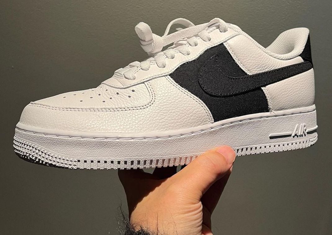 Seen here in a two-tone white and black build, the silhouette appears to be utilizing high-quality tumbled leather in white throughout its mudguard, toebox, eyestays, and heel overlay while black canvas accents along the quarter panel, Swoosh, and heel tab. Tonal white laces and a plastic AF1-branded lace dubrae match the tongue and sockliner and even without a detailed look at other portions of the sneaker, expect to see some form of co-branding details either on the tongue tag, insole, or back on the heel. Rounding out the design is the white-on-white midsole and outsole combo.