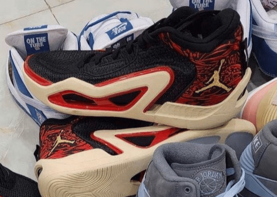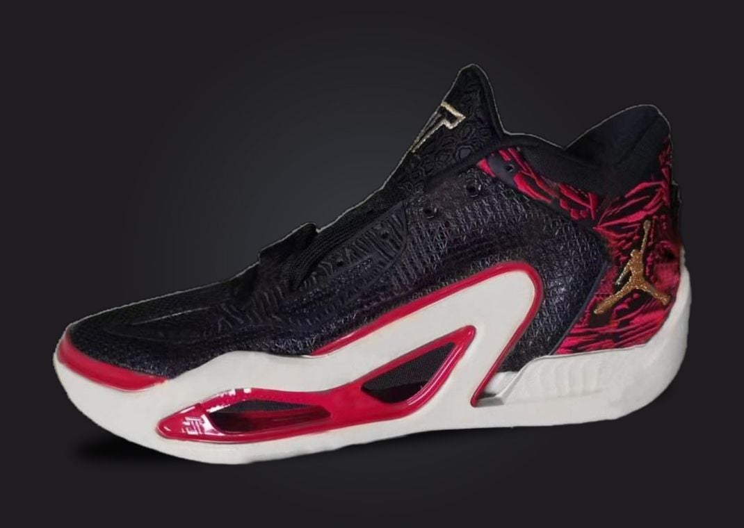 Coming in a “Black/Metallic Gold-University Red-Beach” color scheme, the sneaker appears to take some DNA from CP3s signature line with JB and utilizes an engineered mesh upper in all-black that contains intricate graphics similar to that of “Laser” Jordan releases. Back on the heel, an acid-wash red look takes over with a Jumpman logo in gold breaking up the black/red combo. Jayson Tatum’s logo is barely visible, though we do see that “T” gets embroidered in a light tan shade atop the black tongue. As for tech within the sneaker, an uncaged Zoom Air unit is present in the forefoot.