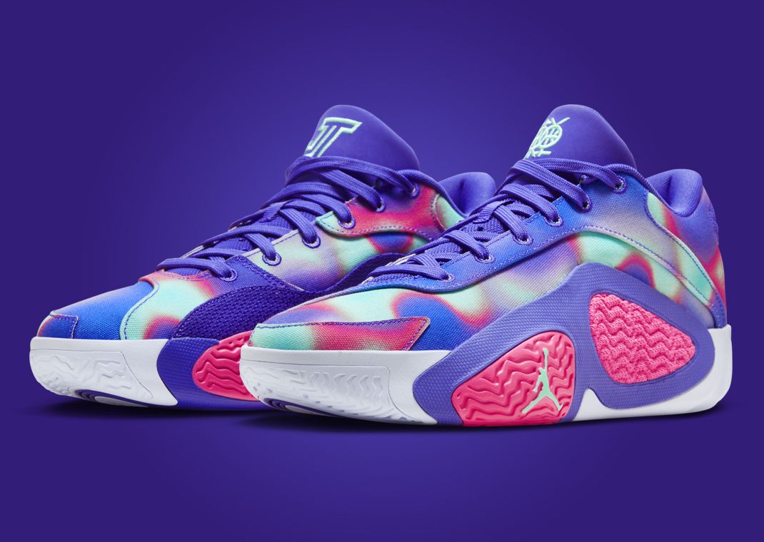 The Jordan Tatum 2 Dongdan is inspired by the vibrant sunsets seen at the tournament. The upper features a striking tie-dye multi-color pattern with purples, pinks, and aqua-green hues. This colorful pattern is predominantly applied to a canvas base, with the tongue and sockliner sporting a solid indigo hue for contrast.