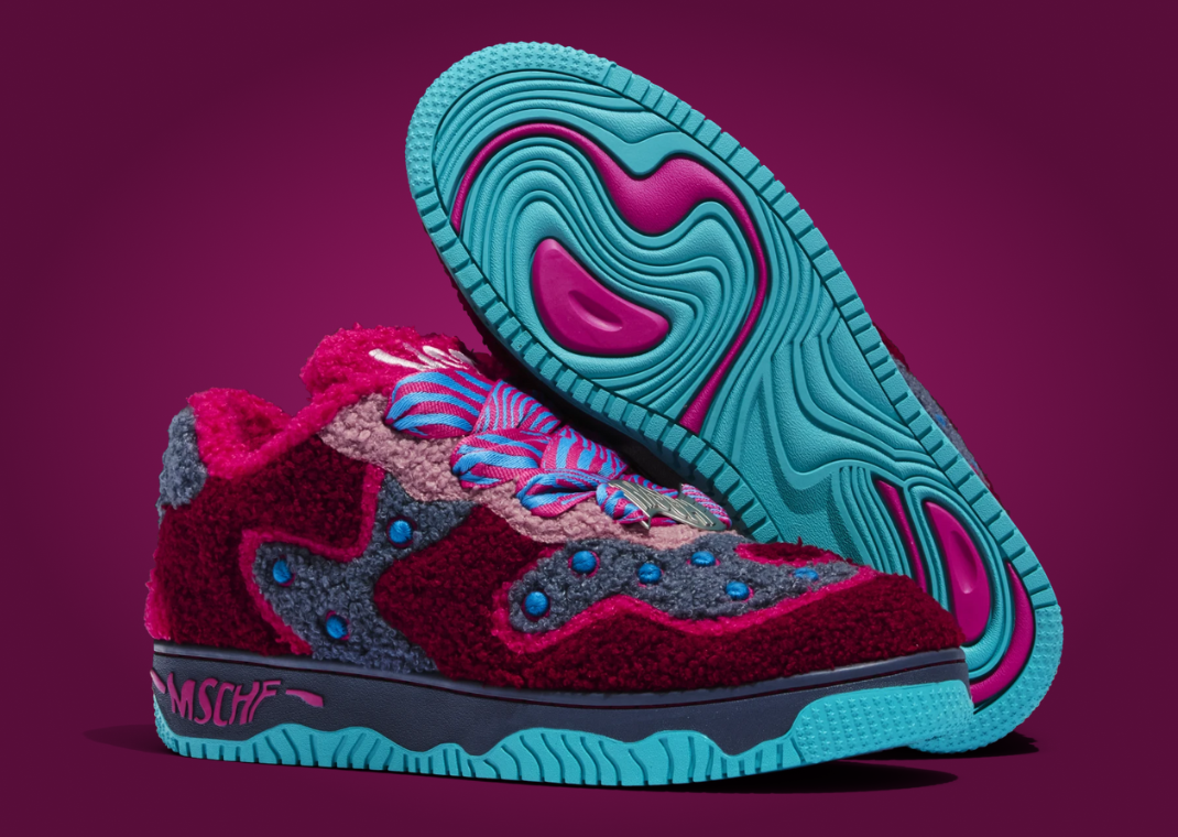 Kid Cudi’s rendition of the MSCHF Super Normal 2 sports a flamboyant design. The upper is covered in a colorful red, blue, purple, and pink fleece patchwork. Blue beads punctuate the fleece-covered upper near the toe and midfoot, bringing an unexpected tactile element to the sneaker. A seersucker pattern adorns the multi-color lace set, adding a playful touch to the overall design. Prominent MSCHF branding is displayed on the tongue and heel. The shoe sits on a grey midsole emblazoned with pink MSCHF branding near the heel. A sky-blue outsole ties the vibrant design together.