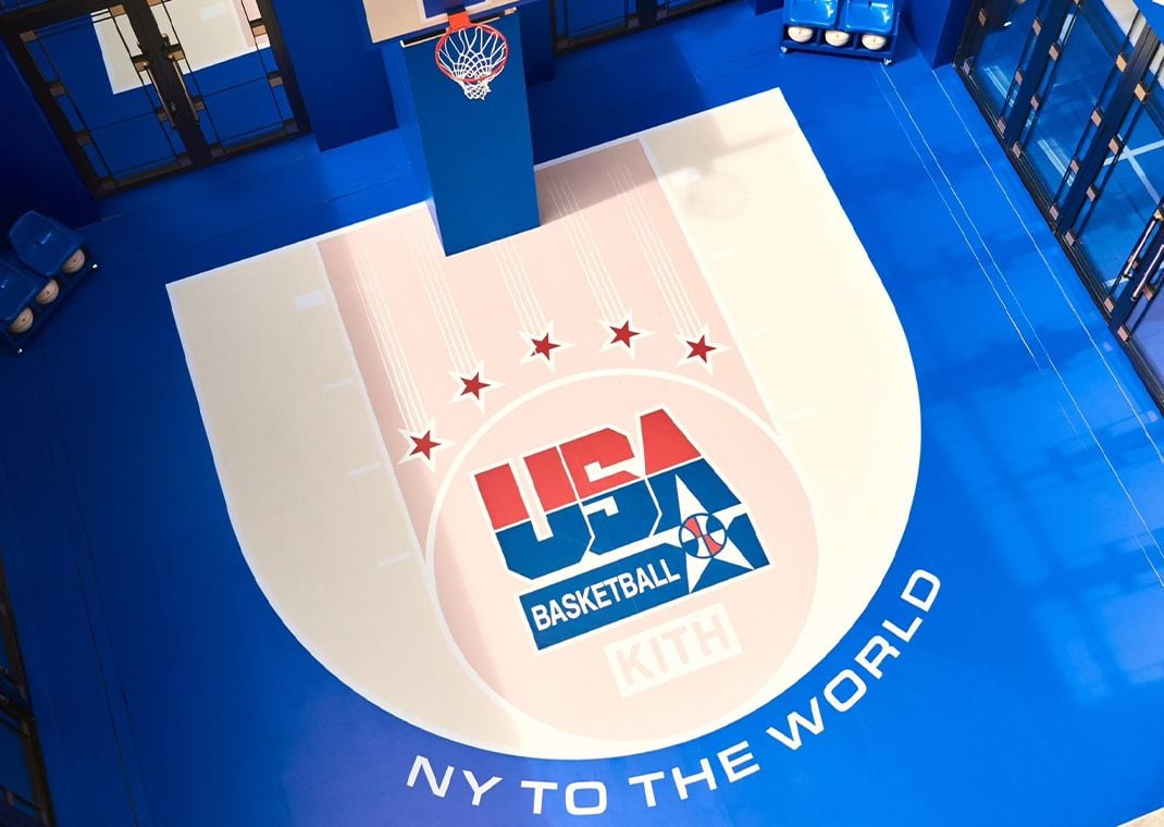 To mark the launch, Kith has transformed the historic Hotel George V in Paris courtyard into a custom basketball court. This luxury hotel near the iconic Avenue des Champs-Élysées now features a court adorned with USA Basketball, Kith, and Hotel George V branding in vibrant red, white, and blue hues. Alongside this, a concept space has been set up where guests can view the collection in detail. While this space at the Four Seasons Hotel George V is for display only, the entire collection will be available for purchase in-store at Kith Paris, just a short walk from the hotel.