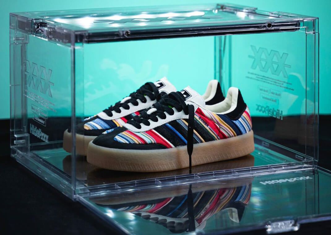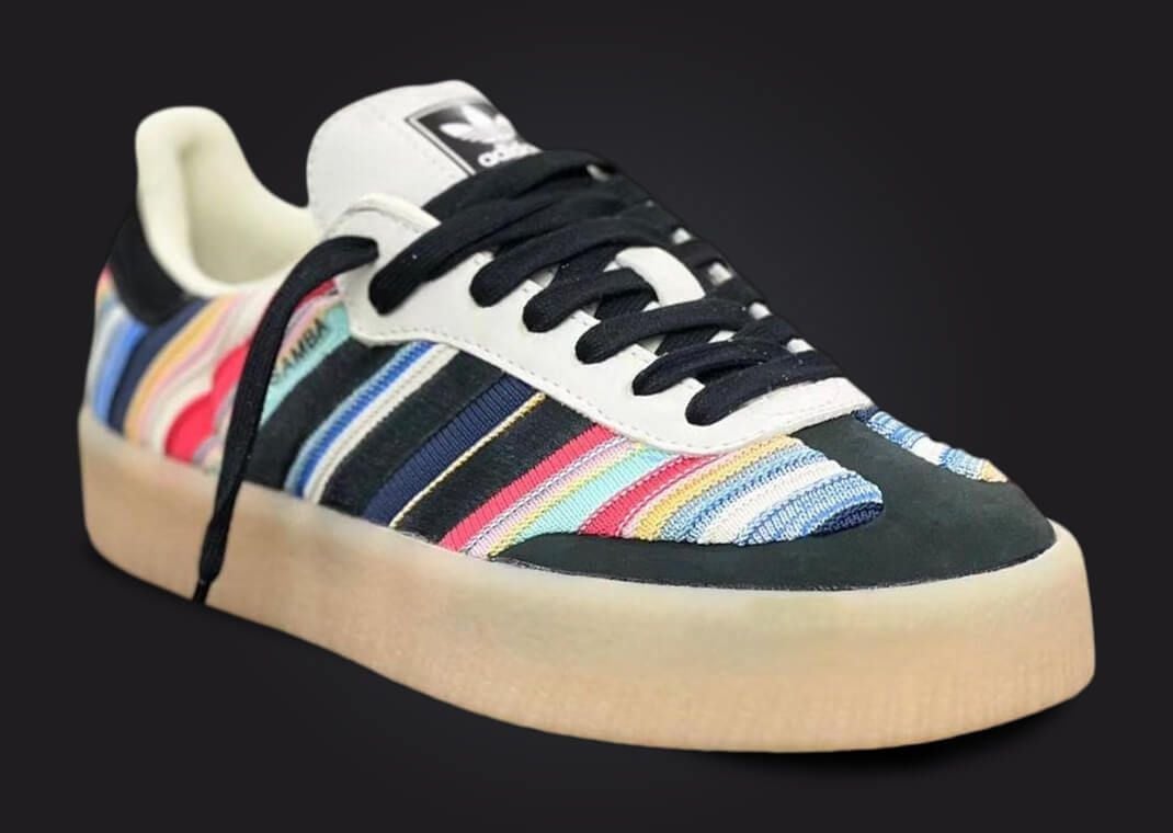 This iteration of the adidas Samba comes adorned with a multi-color textile upper that is tastefully contrasted by black elements on the Three Stripes, T-shaped toe overlay, and heel tab. White is strategically employed on the tongue, eyestays, and sockliner to accentuate the vibrant colors further. “Samba” text on the midfoot comes in black, while a co-branded insole comes in black and white, with Ksenia Schnaider’s green also adorning the insert. Underfoot, a semi-translucent gum rubber midsole and outsole add a finishing touch, giving a slightly retro feel to the modernized design.