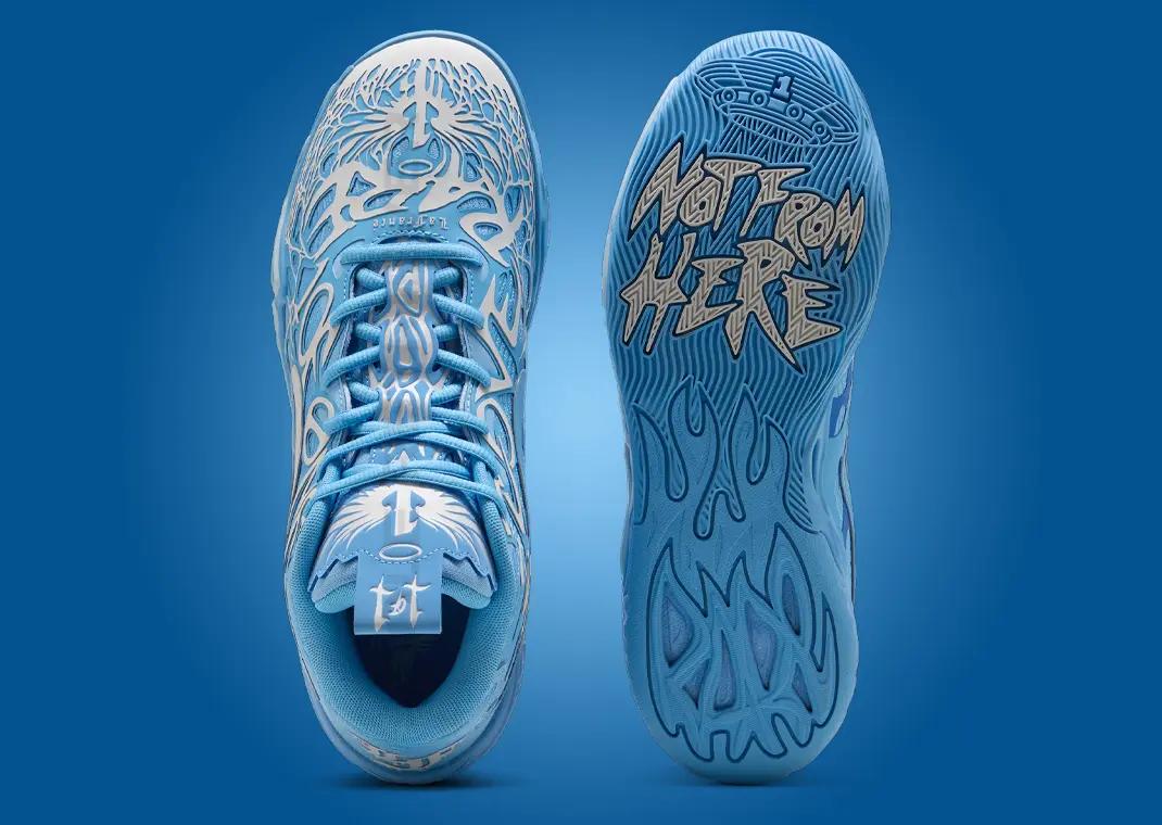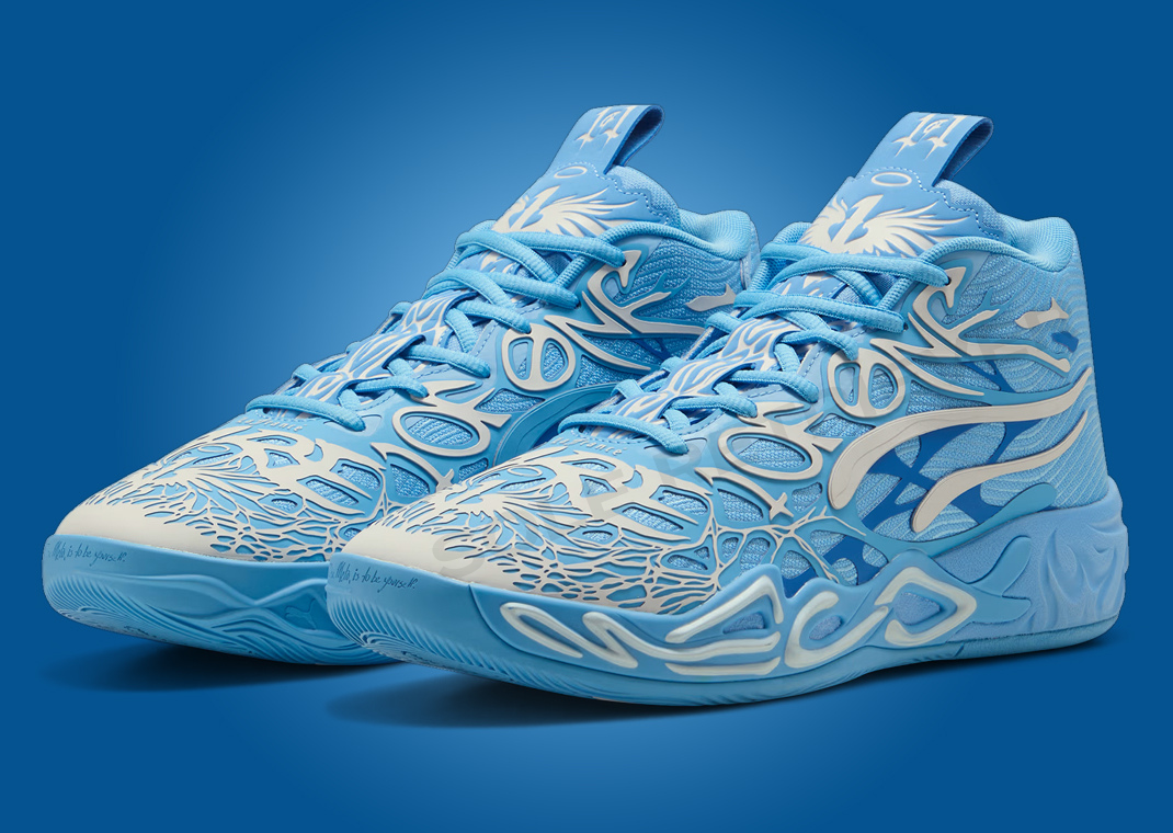 The Puma MB.04 comes with a monomesh base coated in a calming sky-blue hue, featuring a higher cut than its predecessors. Intricate TPU overlays in blue and cream run across the upper, forming branding details unique to LaMelo’s style. These details come constructed thanks to a 4D printing tech for zoned out durability. Words like 1 Of One appear on the left side of each shoe, LOVE on the right side, and RARE is spelled out across the toe, surrounded by a web pattern that adds an artistic flair. The tongue is adorned with LaMelo’s signature phoenix logo in white, while the heel boasts LaFrance branding, featuring the label’s LF logo for a personalized touch.