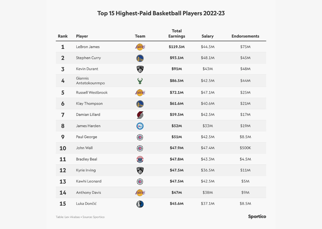 While players in the MLB are landing contracts upwards of $400 million dollars and soccer players are garnering hundreds of millions of followers on social media, the top-paid NBA players quietly are making nearly a billion dollars. Tipping the scale in their favor, endorsements from sneaker brands, sportswear companies, and investments off the court. Thanks to in-depth reporting from sportico.com, we’ve got a look at the top-earning NBA players in the league right now.