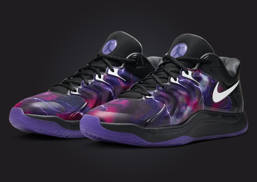 Metro Boomin’s take on the Nike KD 17 takes on a visually striking design inspired by a storm's intensity. The sneaker features a purple haze mesh base adorned with dynamic lightning bolt graphics, embodying the energy and creativity Metro is known for. A clear, wavy TPU overlay nods to the Air Max Plus, enhancing the visual impact while showcasing the underlying graphics. Personal touches include a tongue tag depicting the silhouette from Metro's NOT ALL HEROES WEAR CAPES album and a heart graphic on the heel tab echoing his album merch. Inside, the tongue bears the embroidered name Leland Wayne, Metro’s real name. Wayne also includes dedications to his mother, who passed away in 2022, through her signature on the left heel and her initials on the lateral side of the left sneaker. Underfoot sits a black midsole and a semi-translucent rubber outsole.