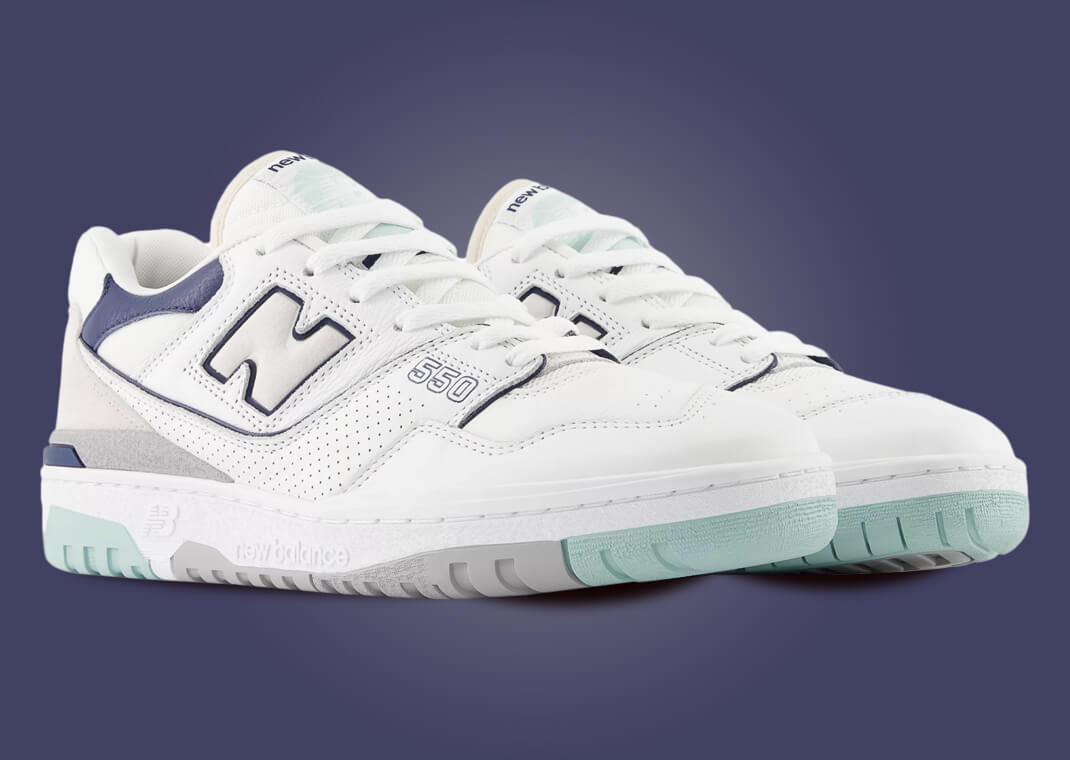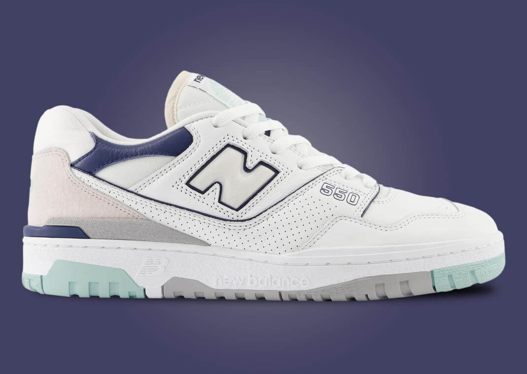 A cool color palette appears selectively throughout the 550, calling to mind bodies of water. The base is constructed out of smooth white leather and a matching thin mesh, while a perforated white leather overlay stretches from the heel to toe box. The outline of the overlay and the N logo are enhanced with a deep navy blue, a color that repeats on the tumbled leather ankle hit and heel clip. The heel is also wrapped with a suede grey panel and stamped with a teal NB motion logo. A white midsole then sits above a grey outsole bookended by teal at the toe and heel.