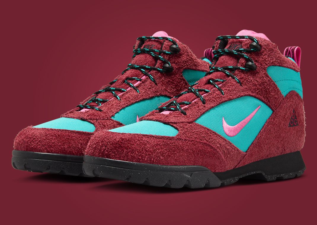 The Nike ACG Torre Mid comes in team red, pinksicle, dusty cactus, sail, and black. Team Red is in a beautiful shaggy suede, covering the overlays, contrasting well with the nylon dusty cactus underlays on the upper. A bold pinksicle-colored Swoosh lives on the midfoot, while the iconic Nike ACG triangle logo is embroidered on the heels. The outsole comes in all black with Nike Grind paint speckles throughout.