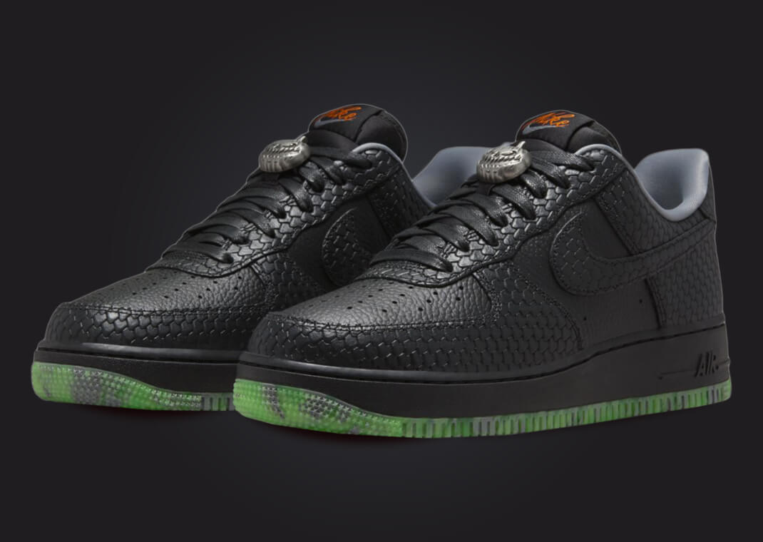 This spooky version of the Air Force 1 dons a predominantly black upper contrasted by metallic silver, grey, and orange accents that invoke Halloween's iconic color palette. A black faux reptile skin graces the mudguard, eyestays, Swoosh, and heel overlay. Tumbled leather makes an appearance on the toebox and quarter panel. The black lace set features a metallic silver Jack O'Lantern, creating a festive touch, while the Nike branding above radiates in bright orange. Gentle grey hits adorn the sockliner and the Nike Air embroidery on the heel. A black AF1 midsole grounds the design, while a green and grey rubber outsole with glow-in-the-dark green sections finishes off the spooktacular theme.