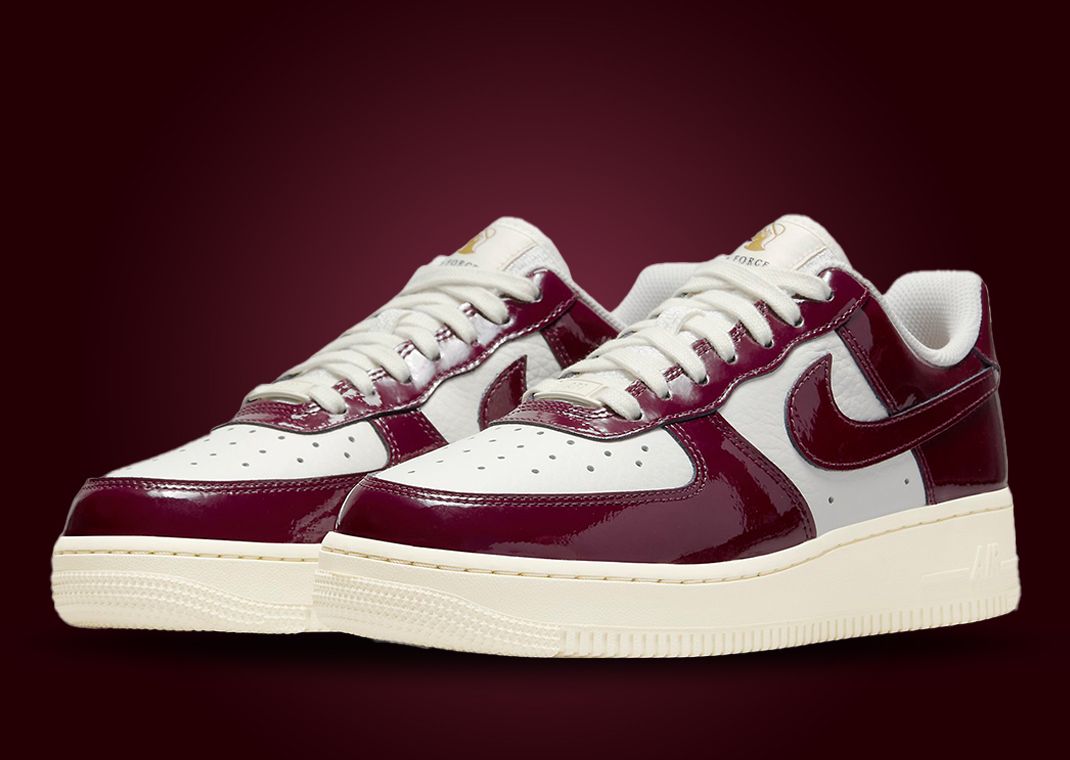 Donning a white tumbled leather underlay, the two-tone upper is accented by burgundy patent leather overlays around the mudguard, eyelets, Nike Swoosh and heel portion. The color scheme here represents the same palette used by ancient Roman battle flags. The tongue tag features a golden embroidered drawing of what appears to be a Roman Goddess with the Air Force 1 branding in black. Below the regal colored upper, an off-white cream AF1 midsole matches the tractioned rubber outsole, bringing together this ancient Roman inspired look.