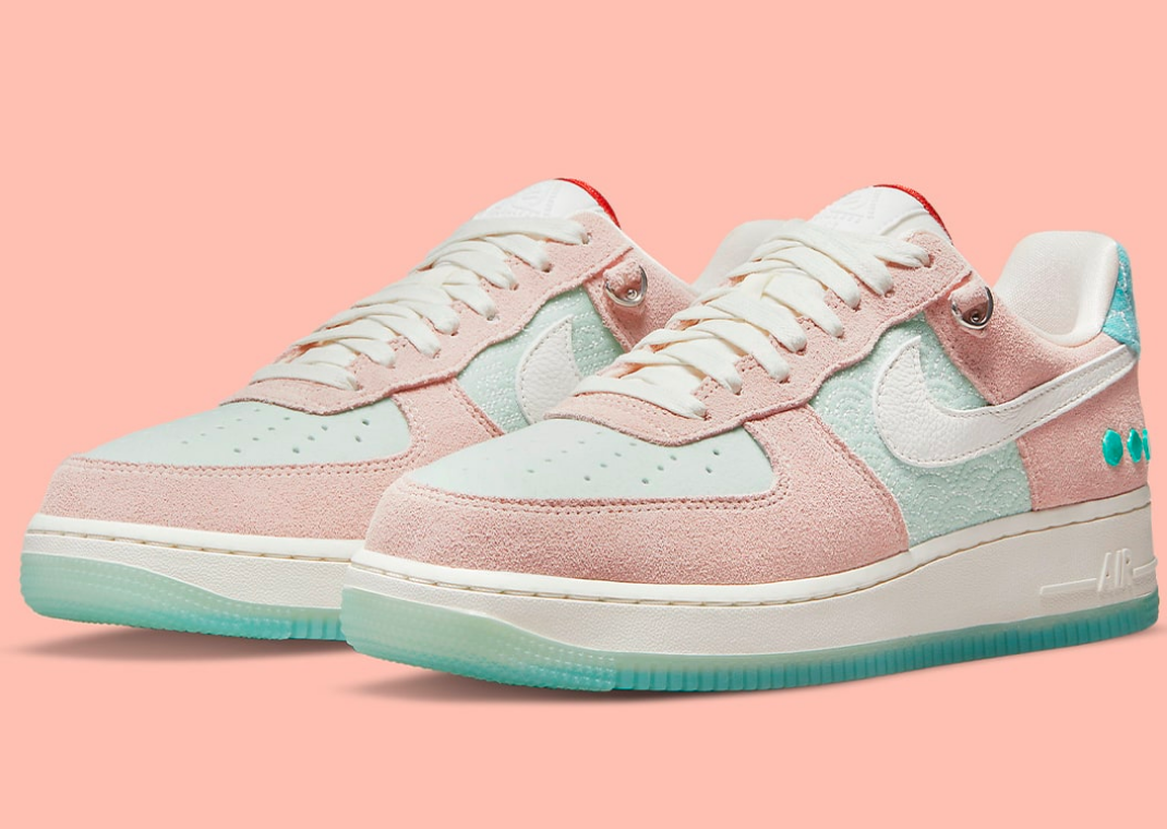 Inspired by the Nike International which debuted fifty years ago as one of Nike’s first running silhouettes, the Nike Air Force 1 “Shapeless, Formless, Limitless” comes in multi-color. Featuring light pink suede overlays and jade underlays with a unique embroidered design on the side panels. Three jade stones are found on the heel with hits of red on the tongue, custom printed insoles and branding on the back heel tab. A white tumbled leather Swoosh on the sides, custom tongue tag and full translucent outsole tie everything together for this China themed pair.