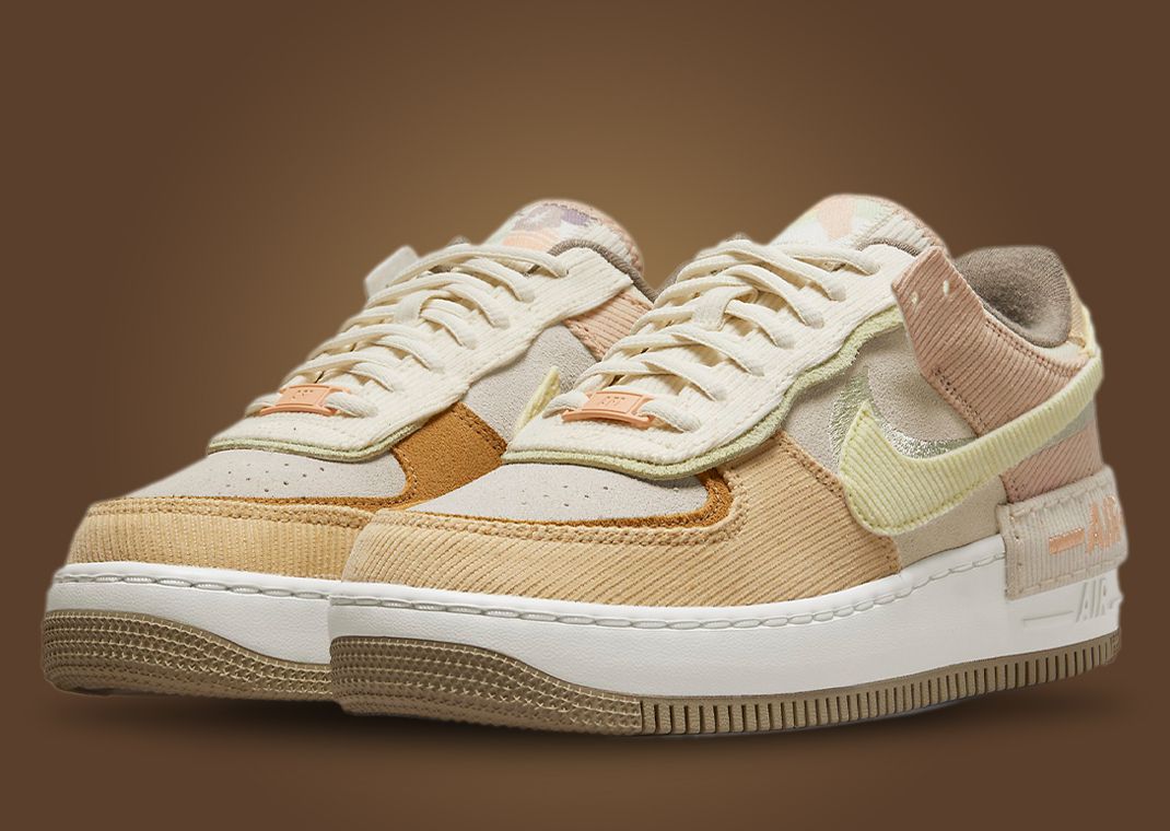 Aiding the Shadow moniker of this AF1, double branding, mudguards, and eyestays make up the silhouette while maintaining the iconic shape of the OG. Switching out the usual leather, a mixture of suede and canvas in a springtime color palette covers the upper. Going up the dual-layered eyestays, the stacked suede and canvas work up towards the floral printed tongue tag. Along the lateral side of the silhouette, a pastel yellow canvas Swoosh sits above the embroidered grey Swoosh.