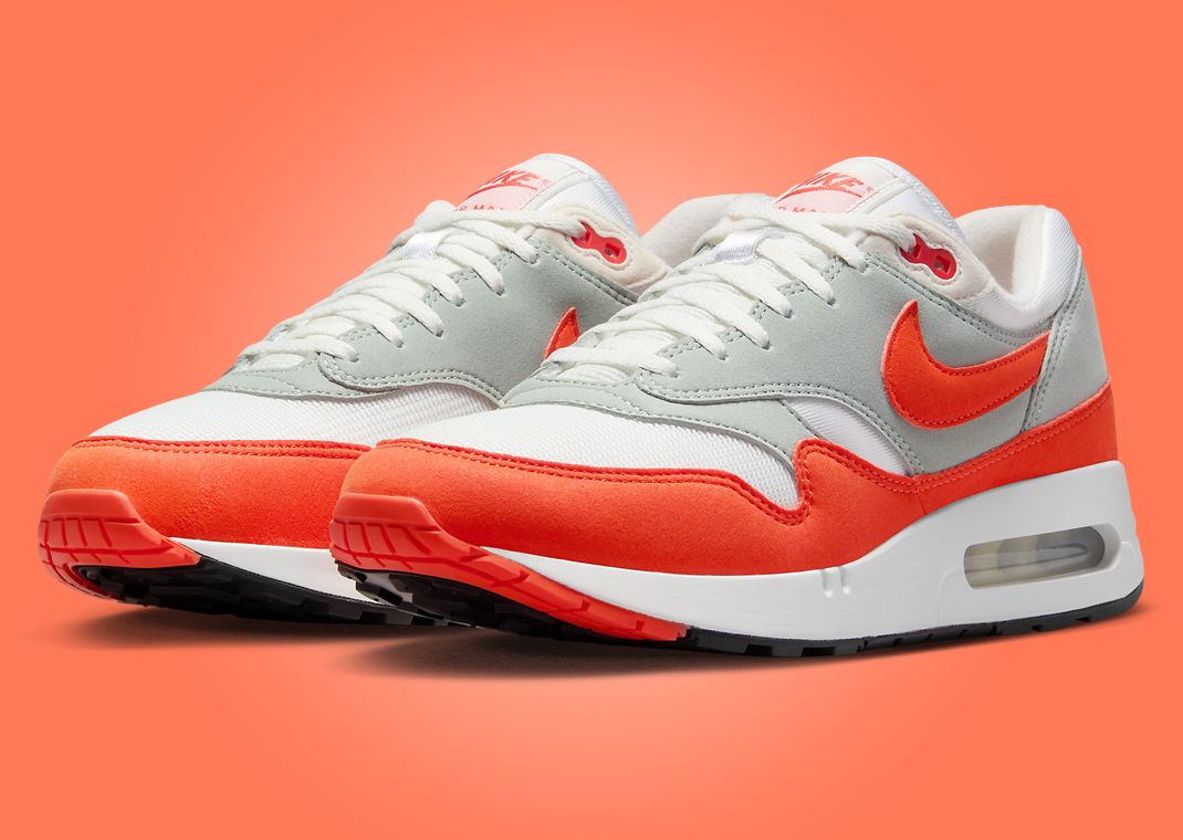 The colorblocking and color palette used here closely mimic the original versions of the Air Max 1, with suede and mesh construction alongside a primarily white and grey color scheme. Cosmic Clay, a reddish-orange hue, takes over the wavy suede mudguard that wraps around the edge of the upper and sole unit and is also featured on the Swoosh resting atop a light pumice suede panel. This grey suede continues on the heel overlay and the vamp, standing out amongst the white mesh base on the toe and collar. As for the use of cosmic clay, it continues on the Nike Air Max branding along the tongue, the TPU eyelet, and the heel’s Nike Air embroidery. This color scheme draws comparisons to the original Sport Red Air Max 1, the first colorway offered on this ‘86 variant. The design is rounded out by a white foam midsole with the Big Bubble four-chamber Air unit in the heel paired with a black and cosmic clay rubber outsole.