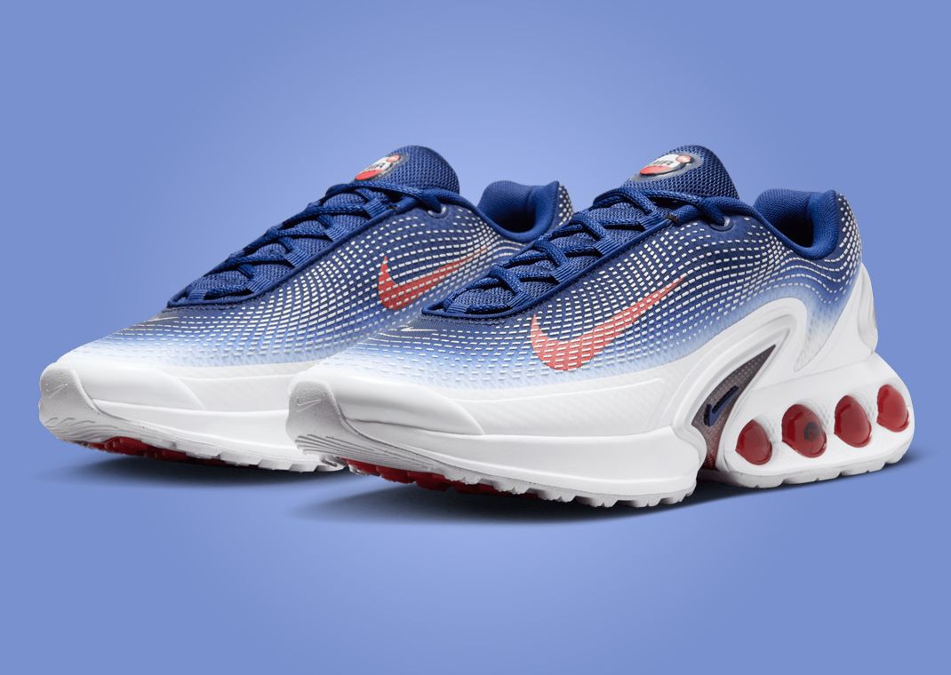 The Nike Air Max DN Olympic pays homage to the games in Paris, France. This pair, in particular, comes in a USA-themed white, bright crimson, blue void, and metallic silver colorway. The blue void-based upper fades to white as it moves from the upper to the sole. Bright Crimson accents the Swoosh, and various branding hits seen on the tongue tag, back heel, and insoles. Carbon Fiber hits, in a gradient-like fade, are found on the back heel and the mid-foot, splitting the solid rubber outsole in half. A white-based midsole houses the Dynamic Air cushioning system throughout the heel, also seen in bright crimson.