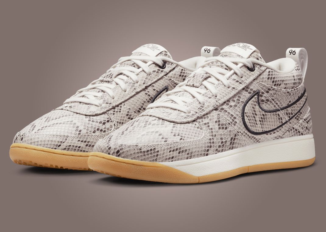 The Nike Book 1 has featured snakeskin details on prior colorways, including The Hike and Rattlesnake pairs. However, this Python colorway covers every panel in a luxurious snakeskin texture from top to bottom. Black embroidery outlines the Swoosh on the midfoot, providing a bold contrast to the snakeskin. Cream laces add a subtle touch, matching the cream accents on the Book-branded tongue tag and the book spine-inspired pull tab on the heel. The pull tab includes "Chapter One" branding and a "96" emblem, the latter symbolizing Booker’s birth year. The sneaker sits on a white midsole and a gum rubber outsole, cushioned with Zoom Air in the heel and full-length Cushlon 2.0 foam.