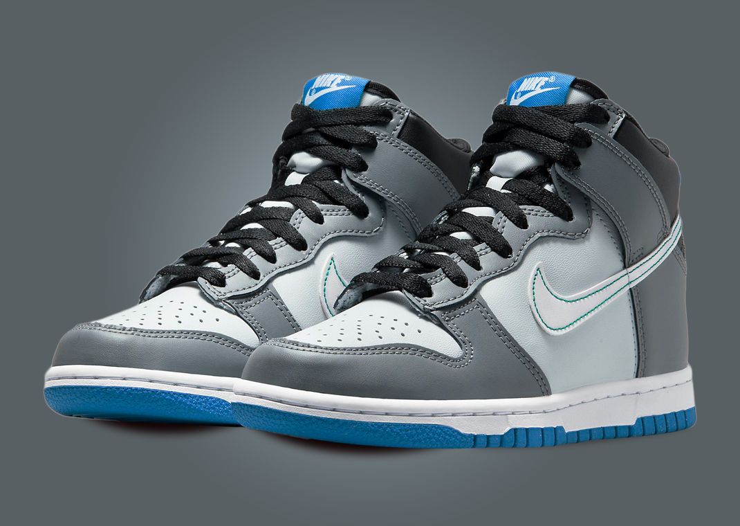 Working on top of a pristine pure platinum leather base, cool grey overlays wrap around the toebox, ankle, and heel for a contrast that's sure to turn heads wherever you go. A Nike Swoosh shoots through the lateral and medial sides, and this is accented with bold green stitching. As if that wasn't eye-catching enough, light photo blue hues hit the tongue tag, pull tab, and midsole underfoot, and to round off this Dunk High, a pair of slick black laces tie everything together, finalizing the daring design.