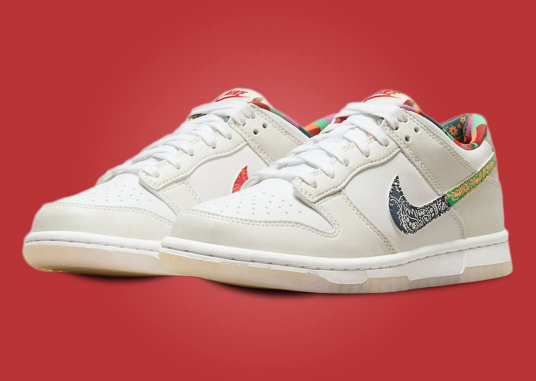 This new Nike Dunk Low opts for a neutral colorway as a canvas for vibrant multi-color paisley patterns. The patterns are skillfully applied to the Swoosh logo and sockliner, injecting a lively contrast for the low-key base. Red Nike text is on the tongue tag, while a chrome finish applied to the heel tab adds a subtle glimmer. The white Nike embroidery found on the heel tab is neatly outlined with red piping, adding consistency to the overall design. A white midsole and clear semi-translucent outsole complete the design.