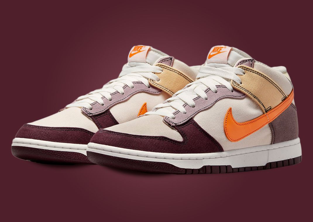 Arriving in a warm weather-ready palette, this Dunk Mid boasts a full canvas construction. Working on top of a creamy coconut milk base, celestial gold, plum eclipse, and night maroon make their way to the ankle flaps, lacing system, and toebox, respectively, resulting in an impeccably colorblocked combination. To the lateral and medial sides, you'll find a bold vivid orange Swoosh in leather. This fiery hue extends towards the tongue tag and heel badge, and all of this sits on top of a crisp sail midsole that's as comfortable as it gets.
